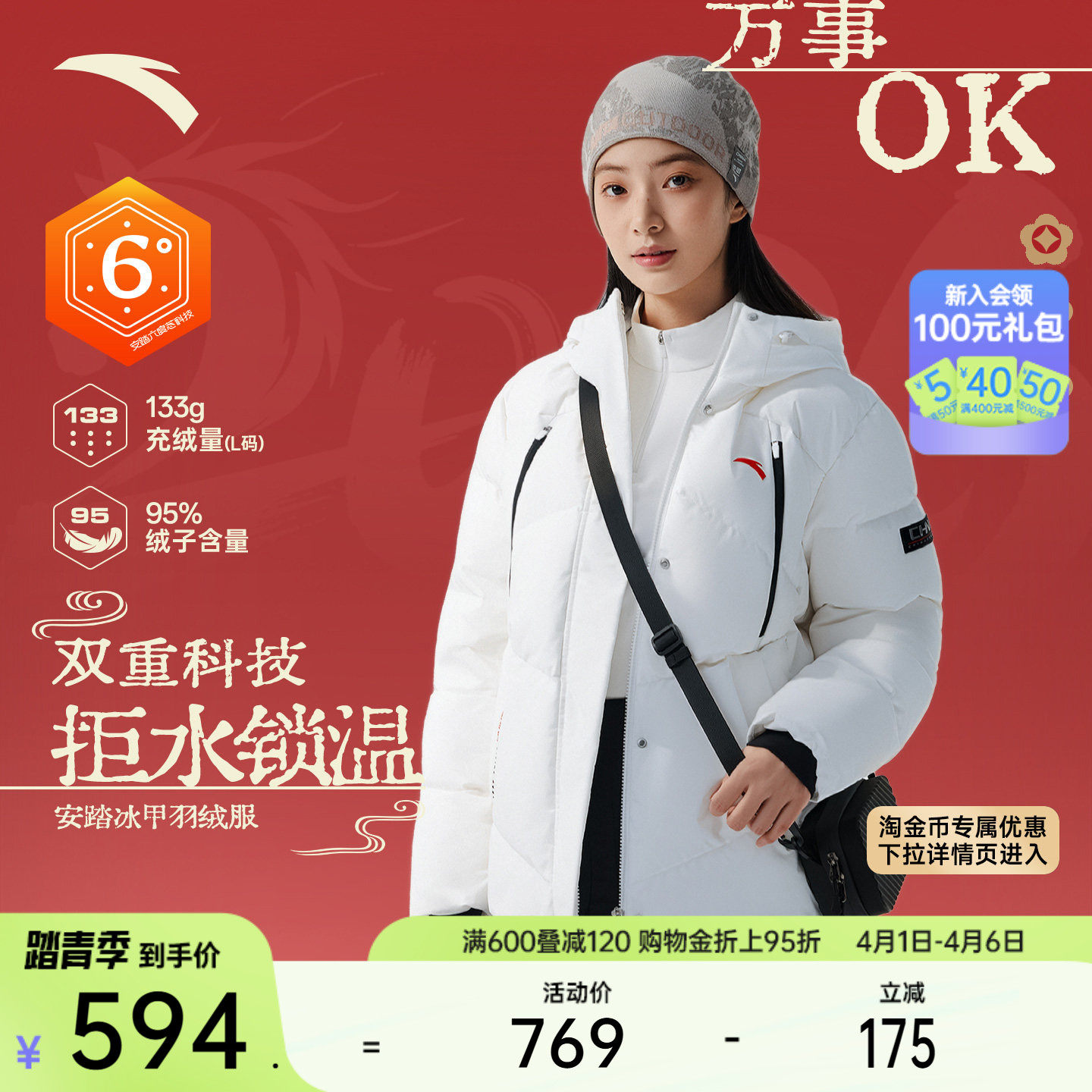 Anta supermodel down jacket丨Six-degree core water-repellent female winter duck down warm cotton jacket 162547935