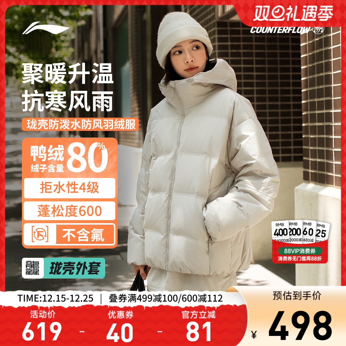 Li Ning outdoor CF trace|Long shell down jacket short women's hooded loose autumn and winter warm duck down sportswear