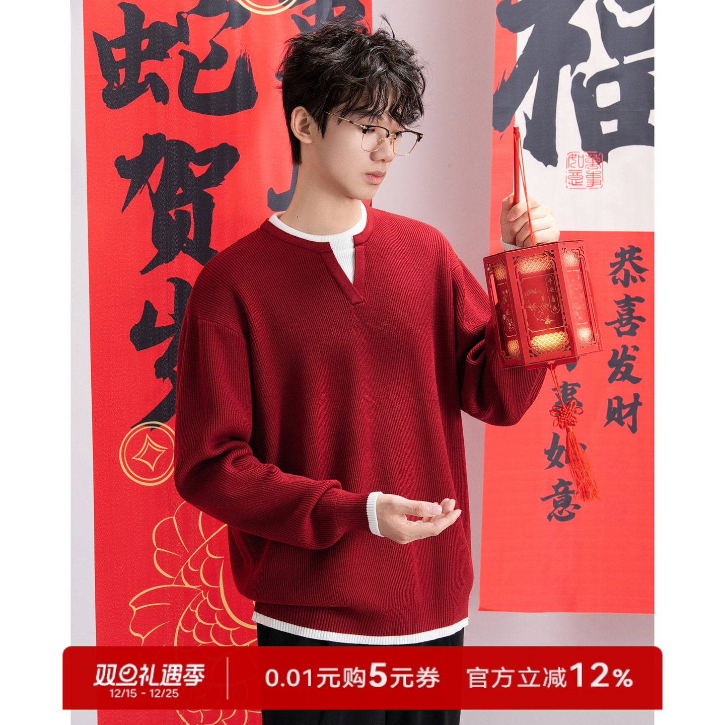 OWNR fake two red New Year sweater men 2025 autumn new year of the Horse natal year Christmas knitted sweater