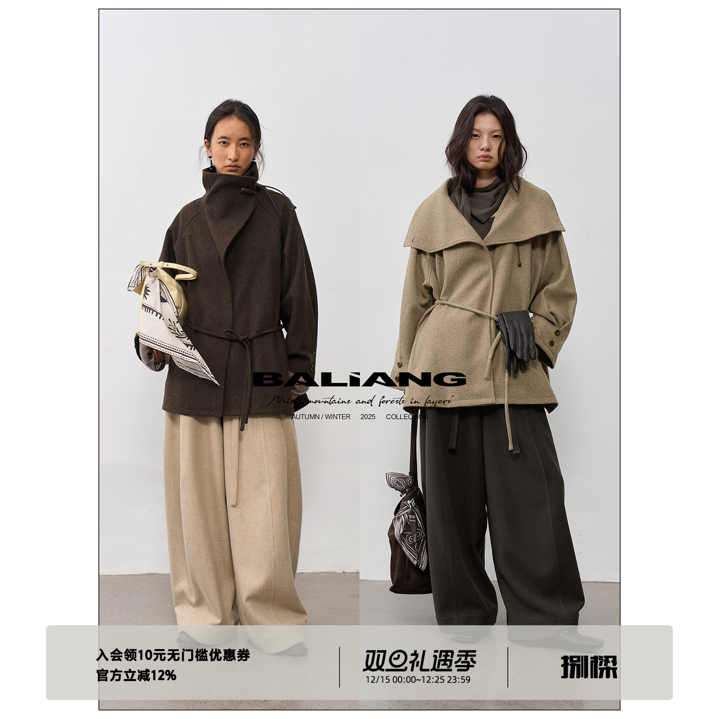 BALIANG "Beam" Rin 'bitter' mid-length horn buckle braided rope stack collar woolen coat jacket