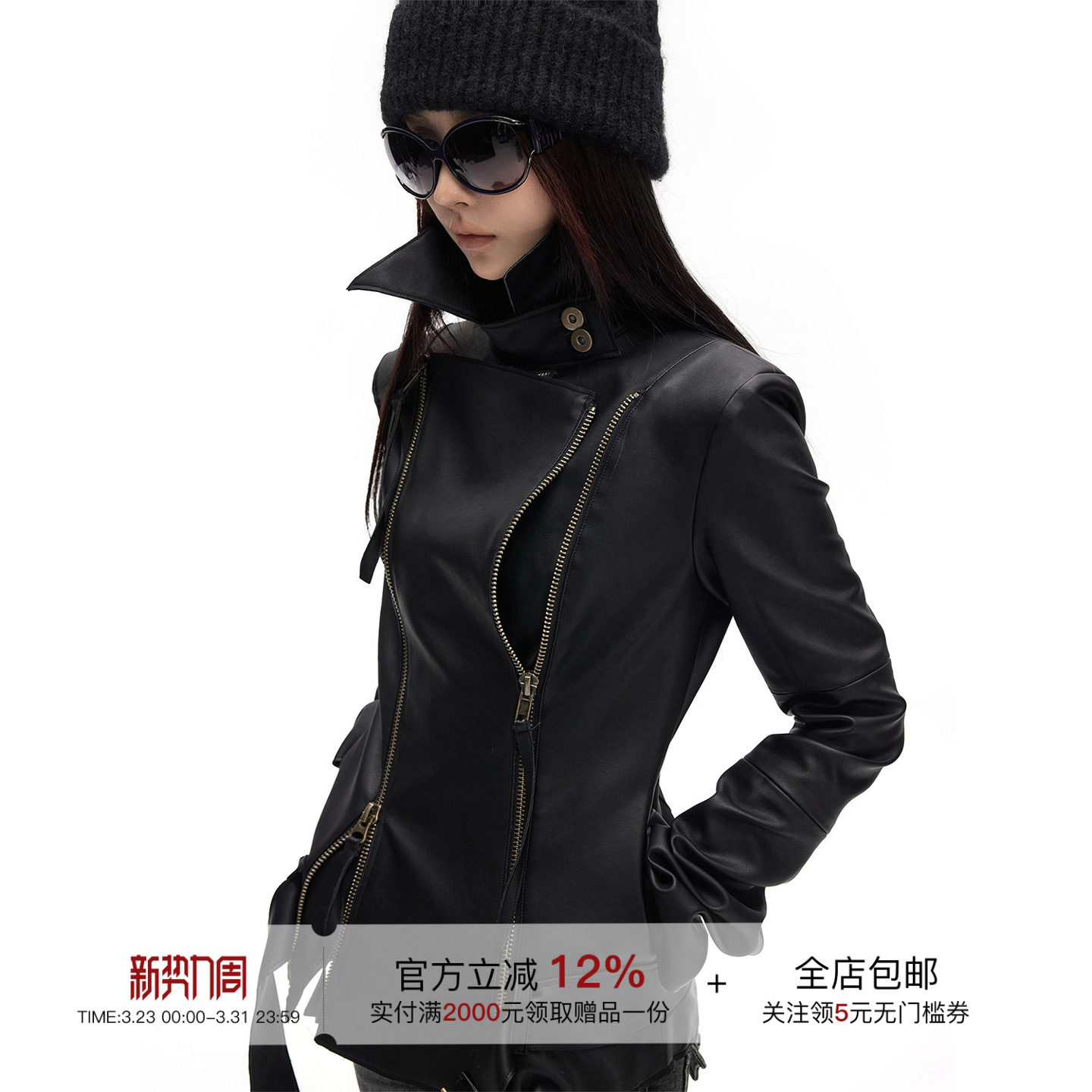 Fu Zhien Heartbeat Radio Imported oil wax sheepskin double-breasted motorcycle style short leather leather jacket woman