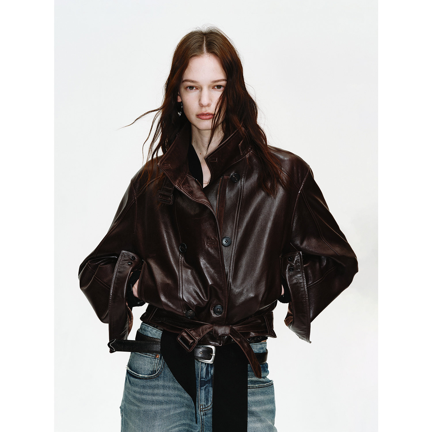 Maillard brown motorcycle leather jacket women's autumn American retro loose jacket amber