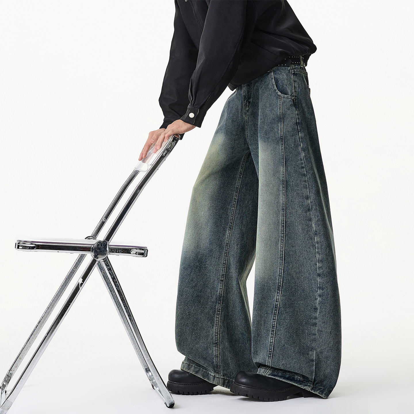 American vintage cat whiskers, washed black scimitar jeans, men's and women's loose wide-legged drapes, distressed floor-length pants