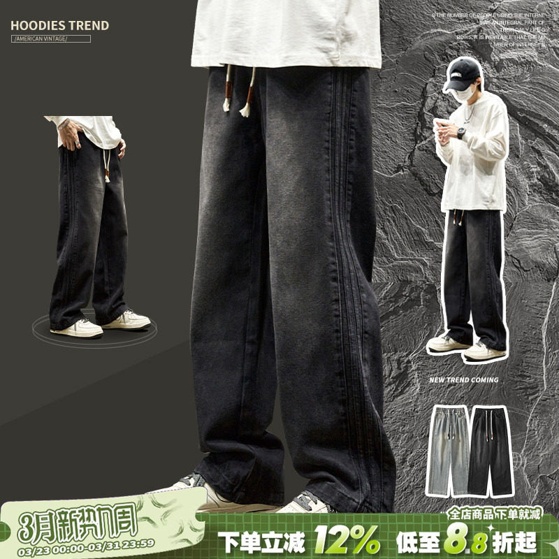 Black and gray men's autumn jeans, Hong Kong style cec loose wide-leg pants, trendy brand retro straight casual long pants