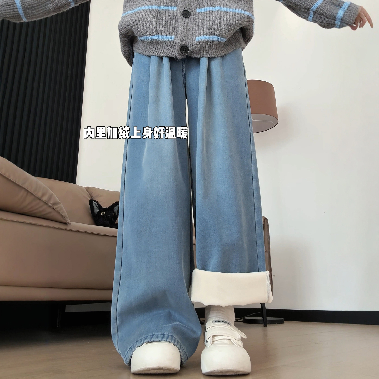 Yilann2025 New Autumn and Winter Women's Korean Washed Blue Wide-Leg Pants Loose and Versatile Fleece High-Waisted Jeans