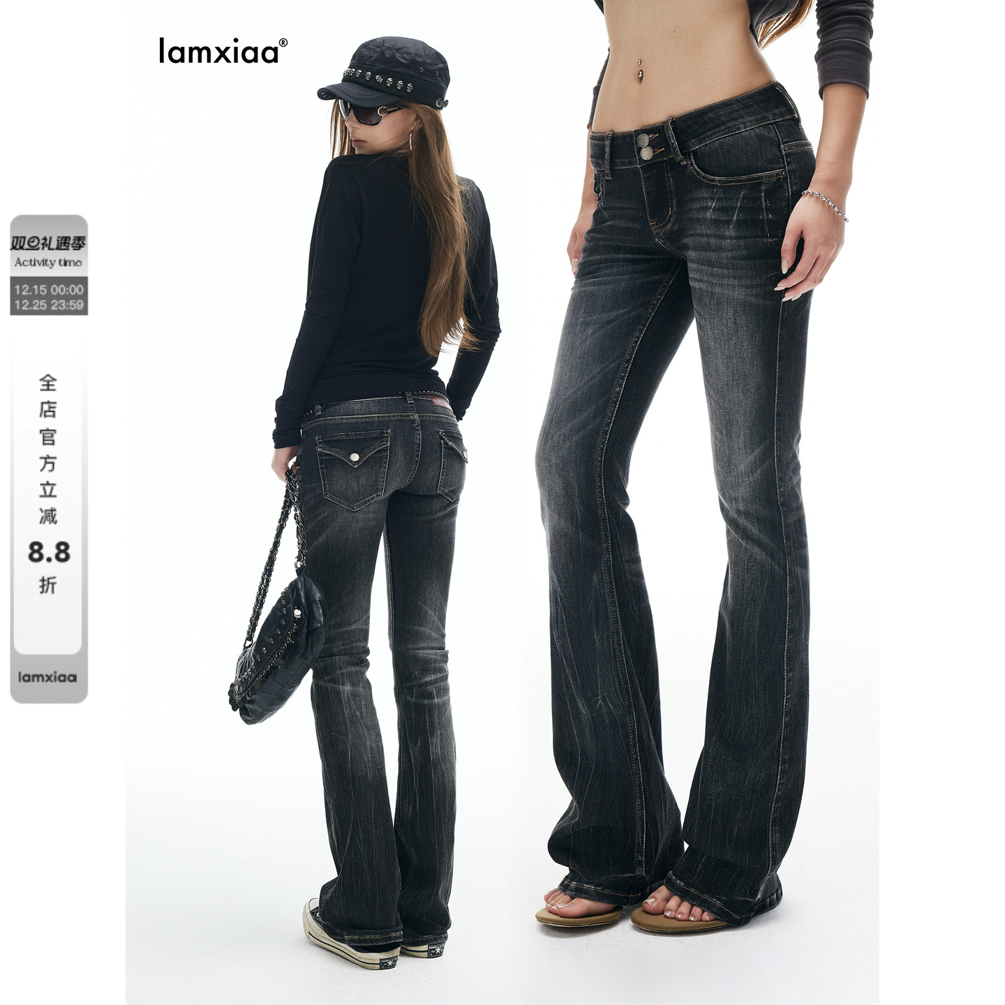 MZVZ black fleece low-rise bootcut jeans women's autumn and winter loose wide legs do not fit the legs draped horseshoe flared pants