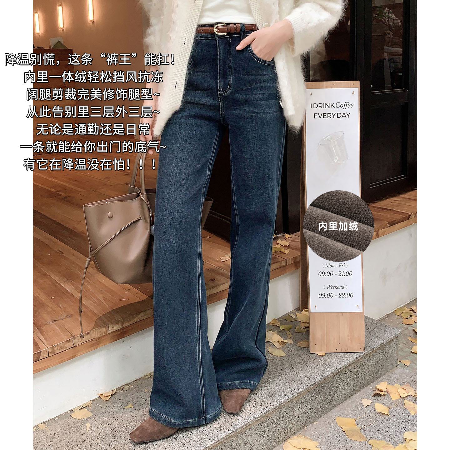 Retro blue wide-leg jeans for women with fleece in autumn and winter, plus size fat mm high-waisted pear-shaped figure slimming crotch covering floor-length pants
