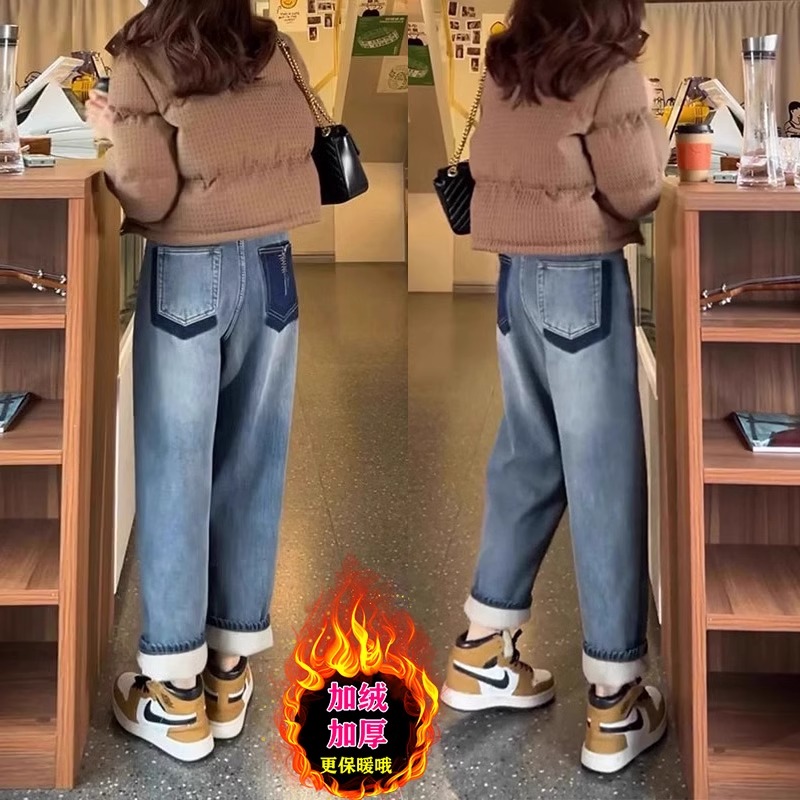 Pear-shaped figure American straight-leg jeans women's autumn and winter plush plush size fat mm high-waisted crotch covering loose wide-leg trousers