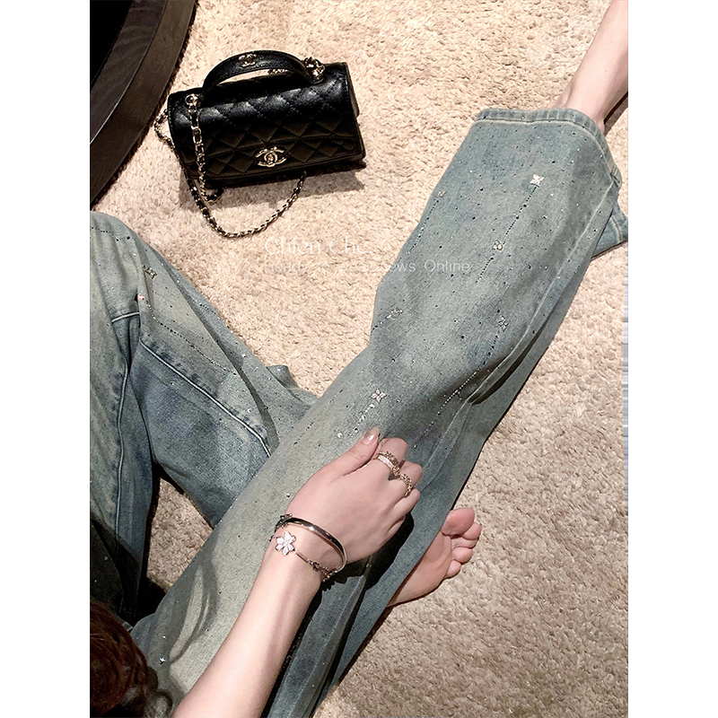 Che Chien Chien Shattered Galaxy Heavy Industry Hot Diamond Straight Pants High-end Retro Washed Blue Jeans Girl