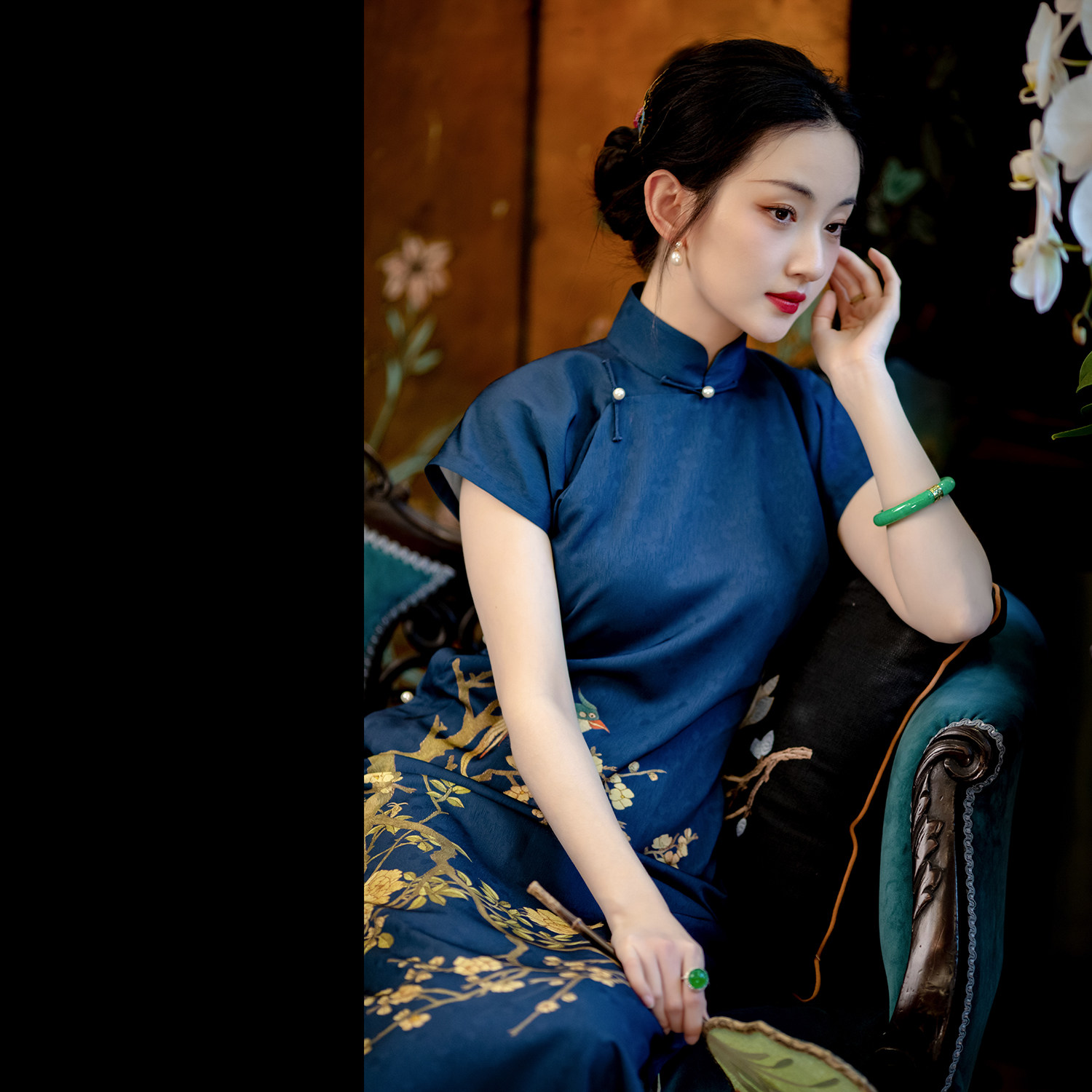 Leaning on the painting evening sunny丨A city of wind fluff丨Summer Republic of China style retro stand-up collar full open placket small bag sleeve printed cheongsam skirt