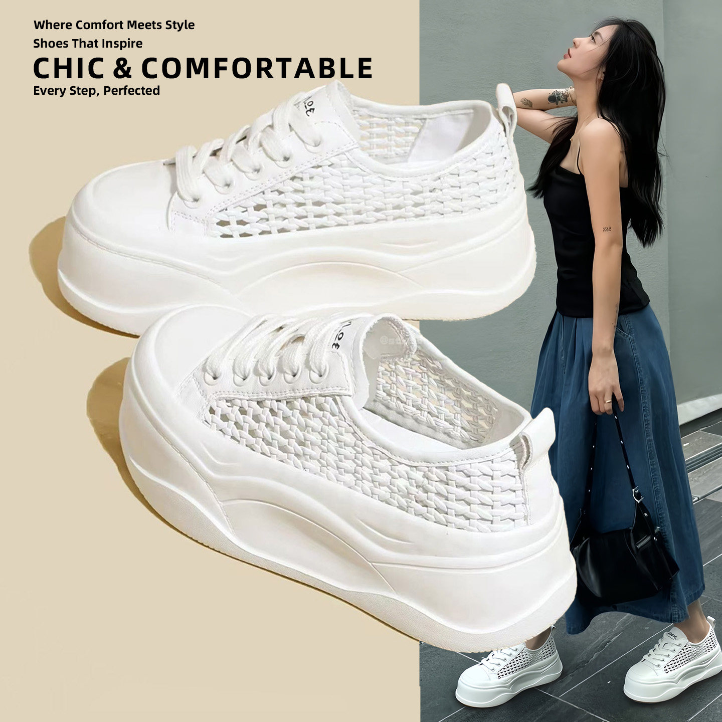 Hong Kong leather woven white shoes women's 2026 spring/spring summer new muffin thick-soled lightweight hollow breathable casual shoes