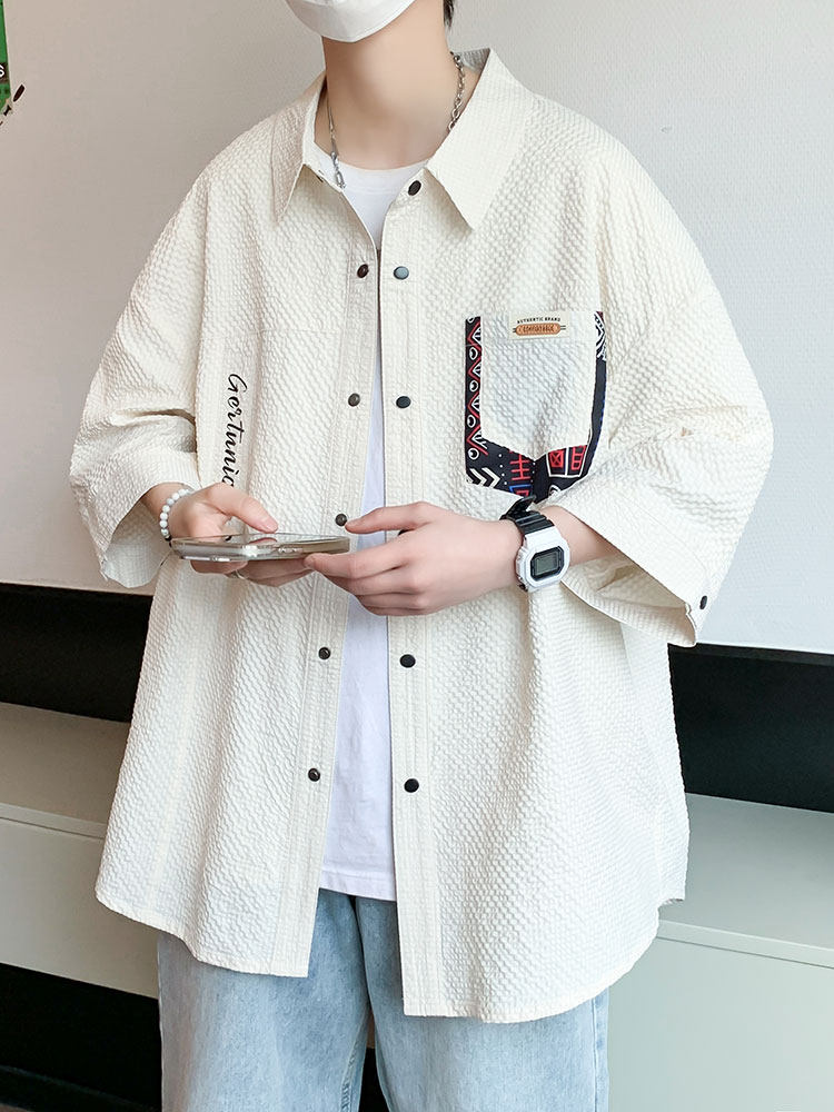 Summer Short-Sleeved Shirt for Men, Youth Hong Kong Style Trendy Brand Three-Quarter Sleeve Shirt, Junior High School and High School Student Sun Protection Jacket
