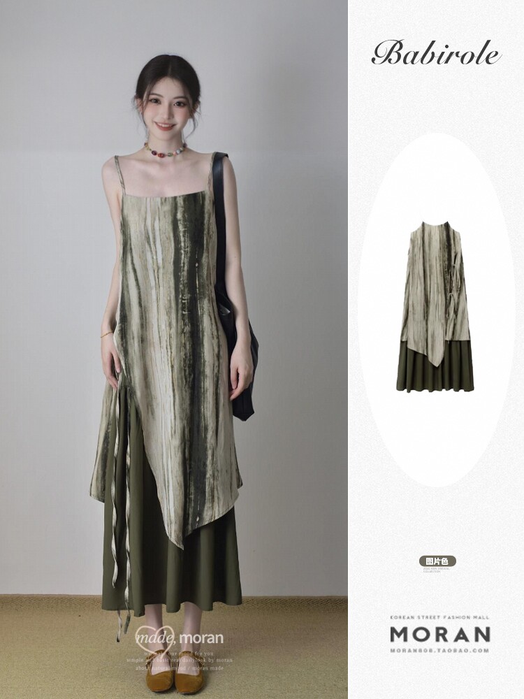 New Chinese-Style Green Suspender Dress for Women, Summer 2025 New Model, Fake Two-Piece, High-End Feel, Long Dress for Seaside Vacation