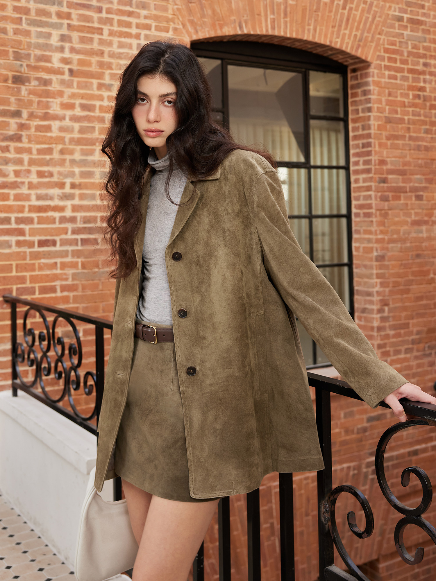 Madeinam Matte Suede Leather_Retro Moss Green Shirt-Style Suit Collar Jacket/Short Skirt Suit