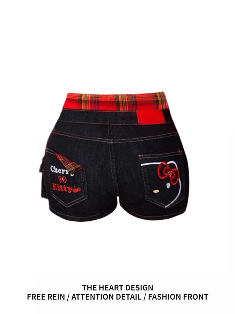 American-Style Hello Kitty Embroidered Hot Girl Denim Shorts for Women, Summer Design with Plaid Patchwork and Hip-Hugging Hot Pants