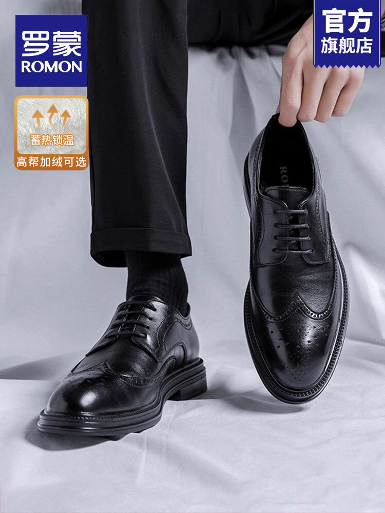 Romon Brock Leather Shoes for Men, Young Business Formal Wear, Soft-Soled Commuting Carved Men's Shoes, Winter Pointed-Toe Derby Shoes Rm