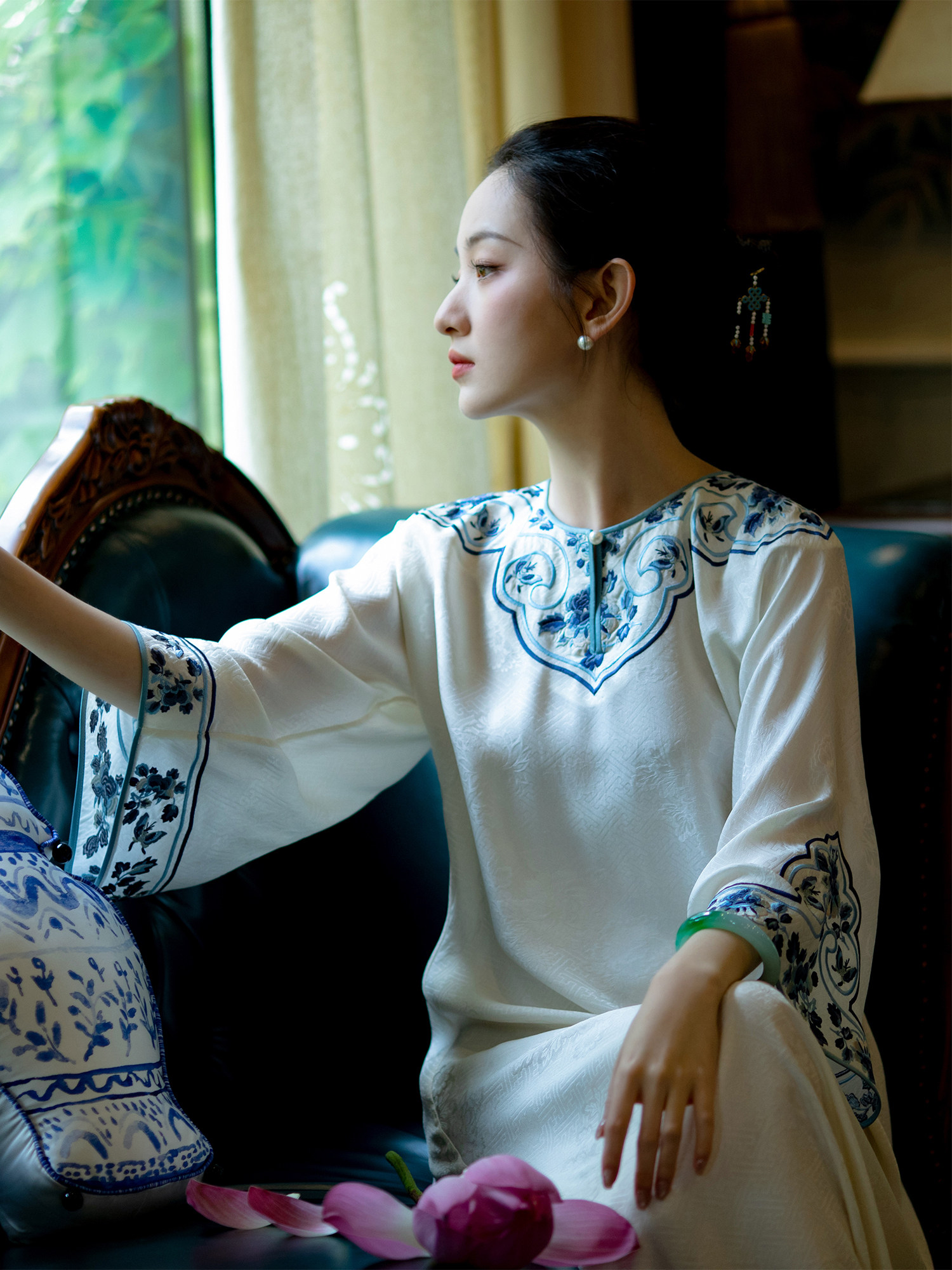 Qiong Ling Fu Yun | 2025 Summer New Collection | Silk Perforated Cheongsam with Three Blue Embroidered Cloud Shoulders, New Chinese Style Dress