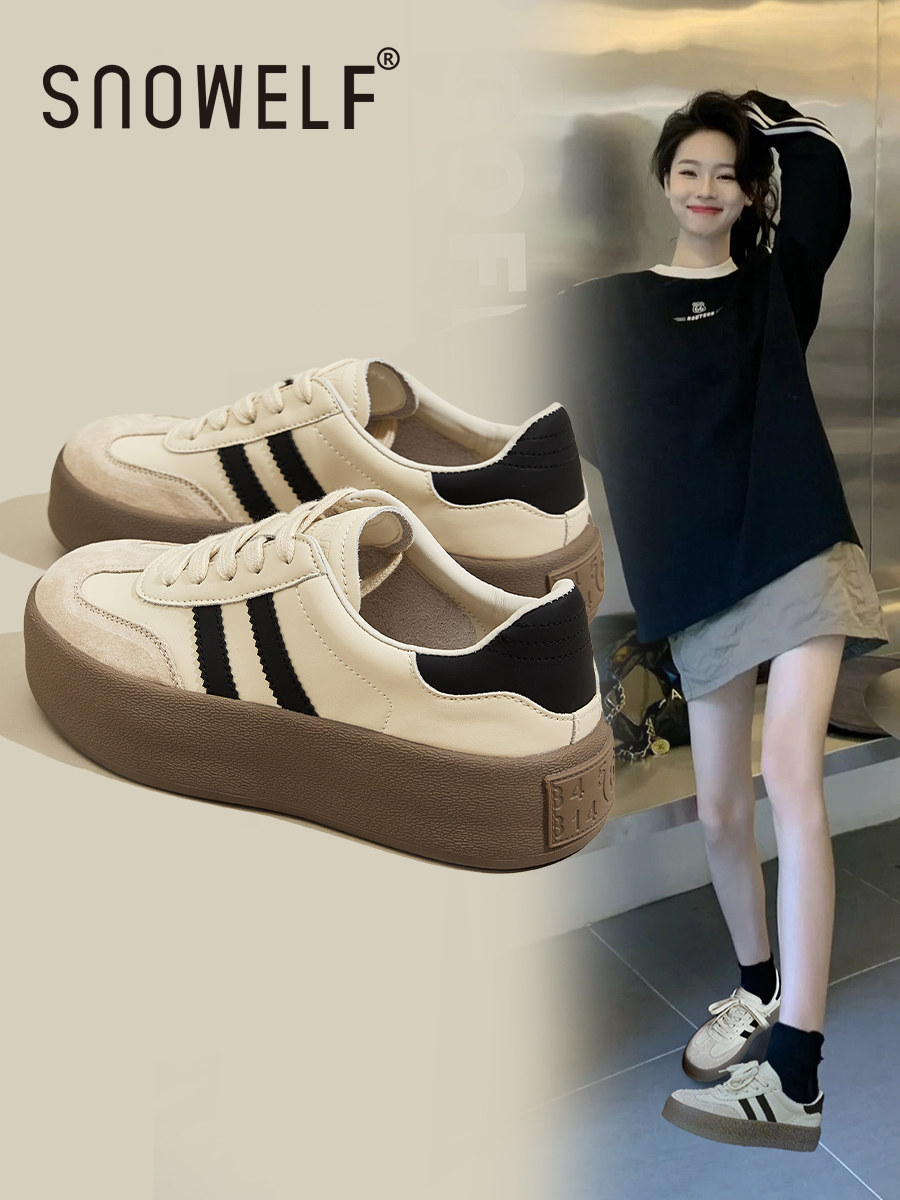 Women's Thick-Soled Casual Sneakers 2025 Autumn and Winter New Beige Fleece-Lined Women's Shoes with Hidden Height Increase and German Training Style