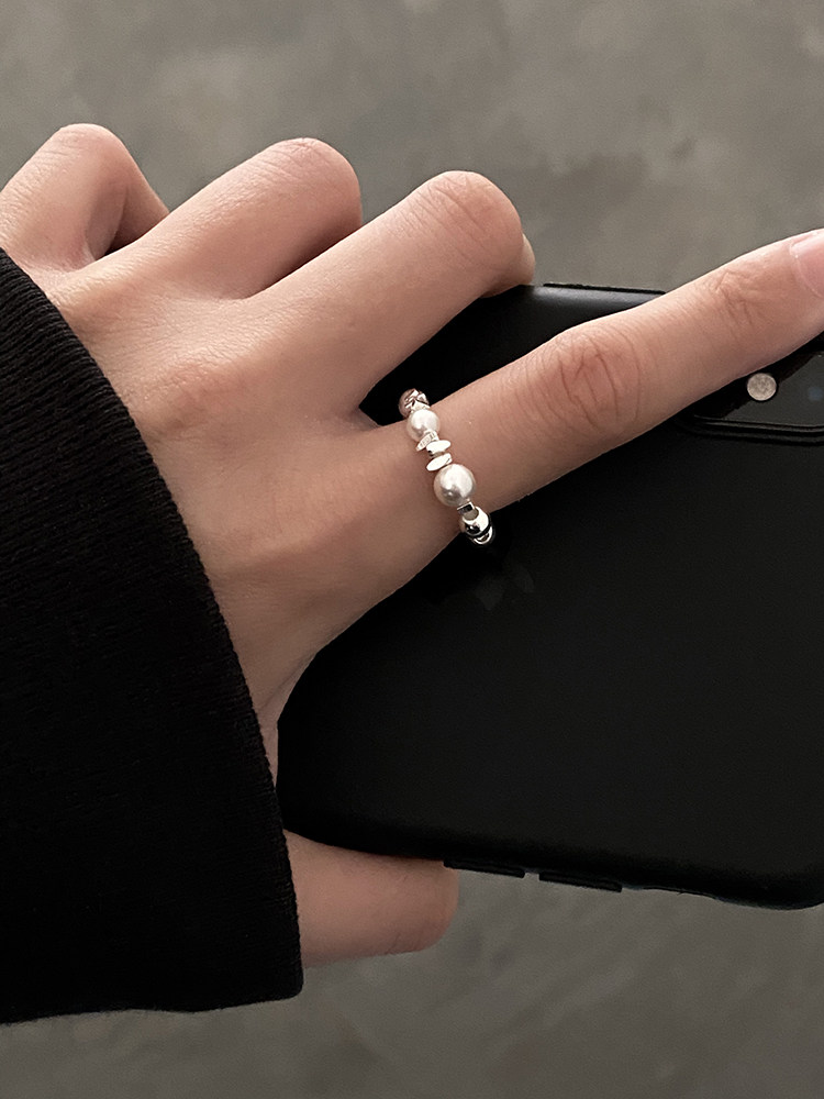 Doudoustore High Color Retention Elastic Shijia Pearl Silver Ring for Women Casual Trendy Cool Knuckle Ring Jewelry