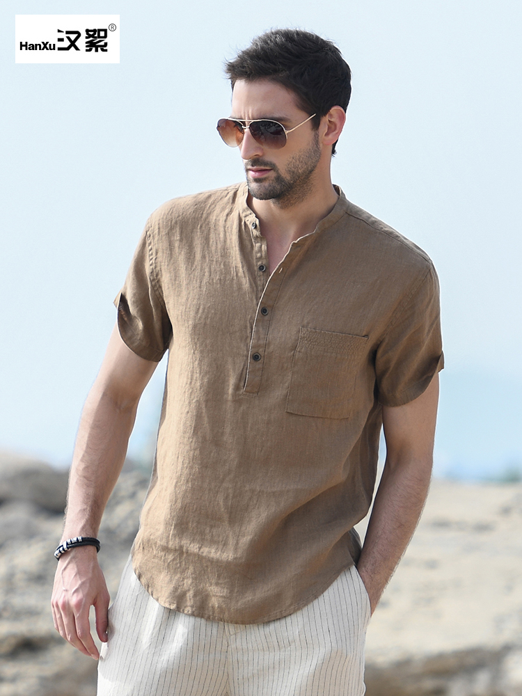 Hanxu Soft and Breathable Short-Sleeved Linen Shirt for Men, Artistic Casual Loose Top, Thin Stand-Up Collar Linen Shirt