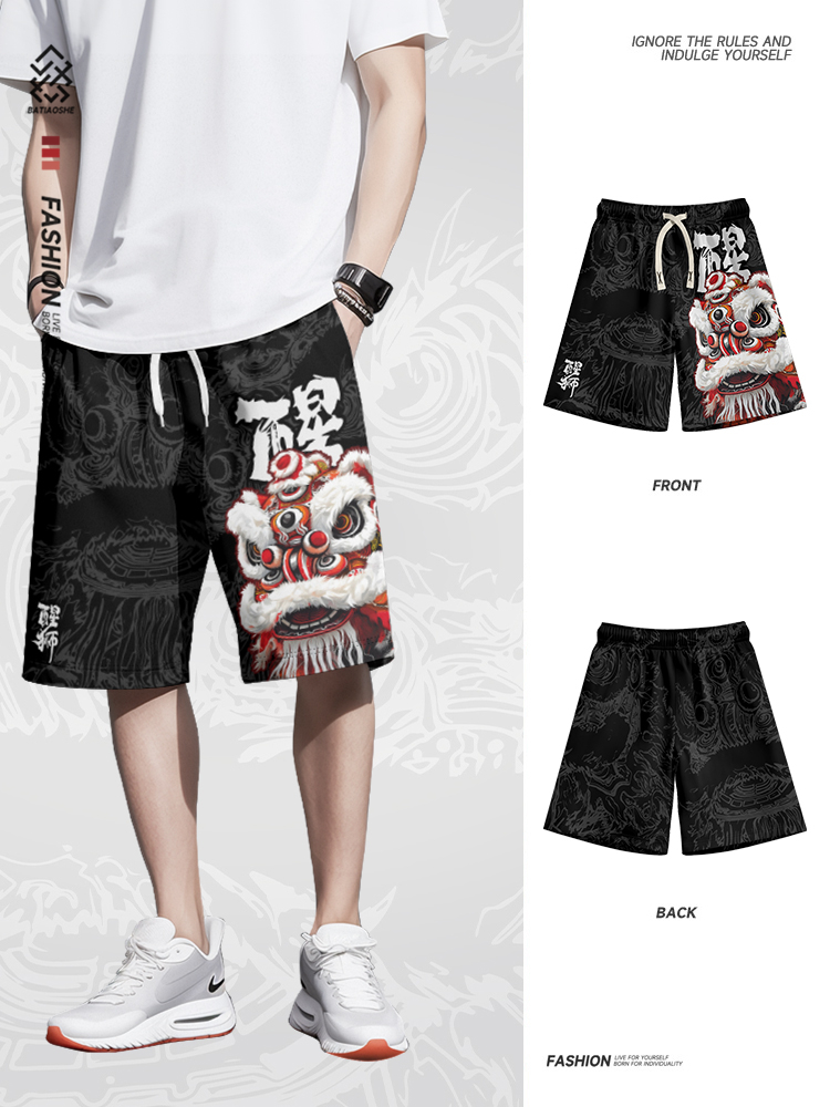 2025 New Summer Casual Shorts for Men, Lion Awakening, National Fashion, Quick-Drying, Thin, Loose, Black Five-Point Pants for Men