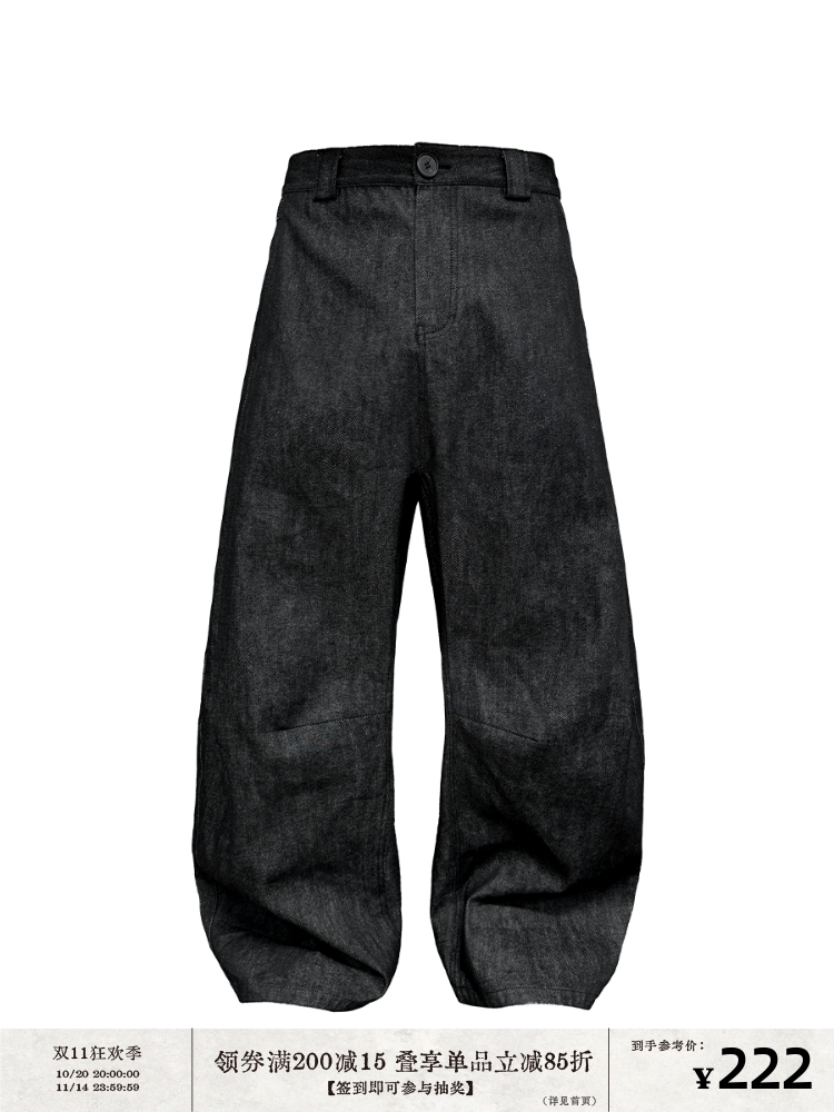 Jcaesar Denims Low-Rise Pleated Raw Denim with Knee Pleats, Double Side Seam Construction Lines, Wide Scimitar Silhouette