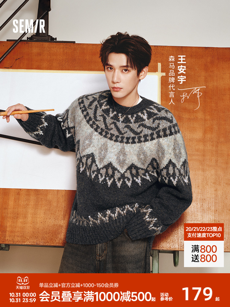 Wang Anyu's Same Style Semir Sweater Men's Fair Isle Jacquard Knitwear 25 Winter Couple Retro Sweater Iridescent Yarn