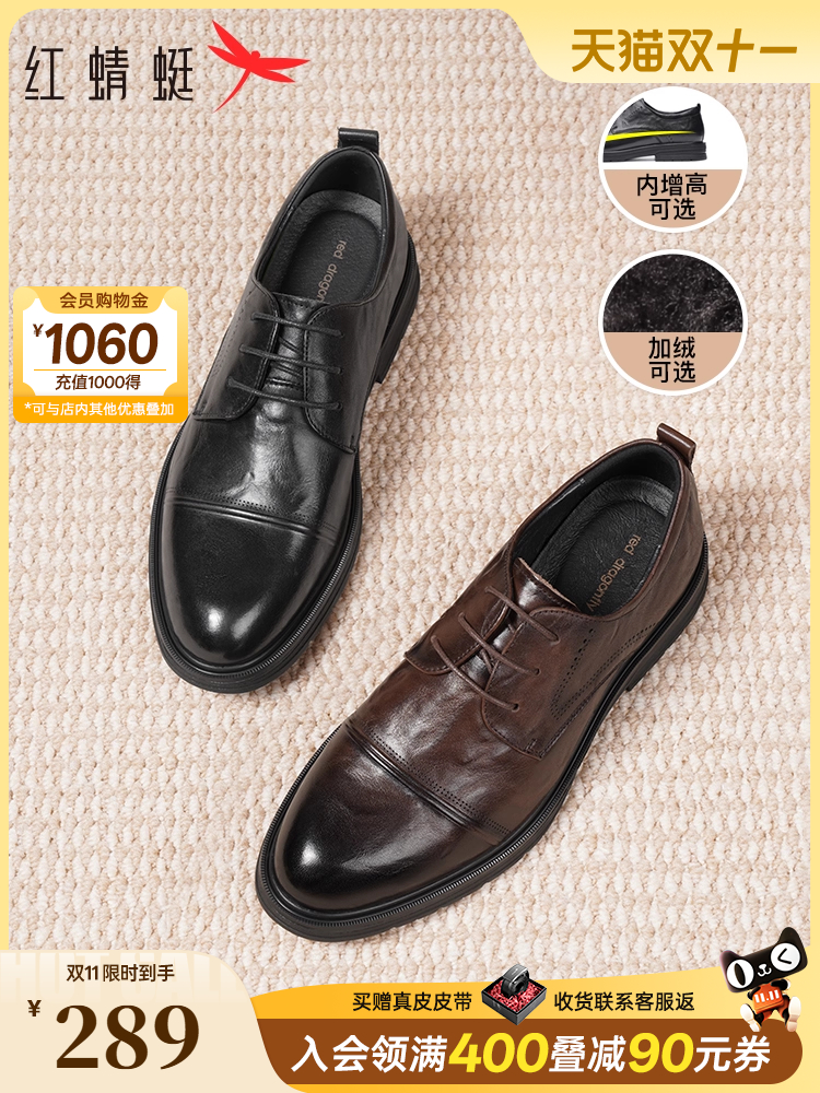 Red Dragonfly Men's Leather Shoes, Autumn Business Three-Strap Derby Large Size Men's Shoes, Height-Increasing Genuine Leather Wedding Groom Shoes