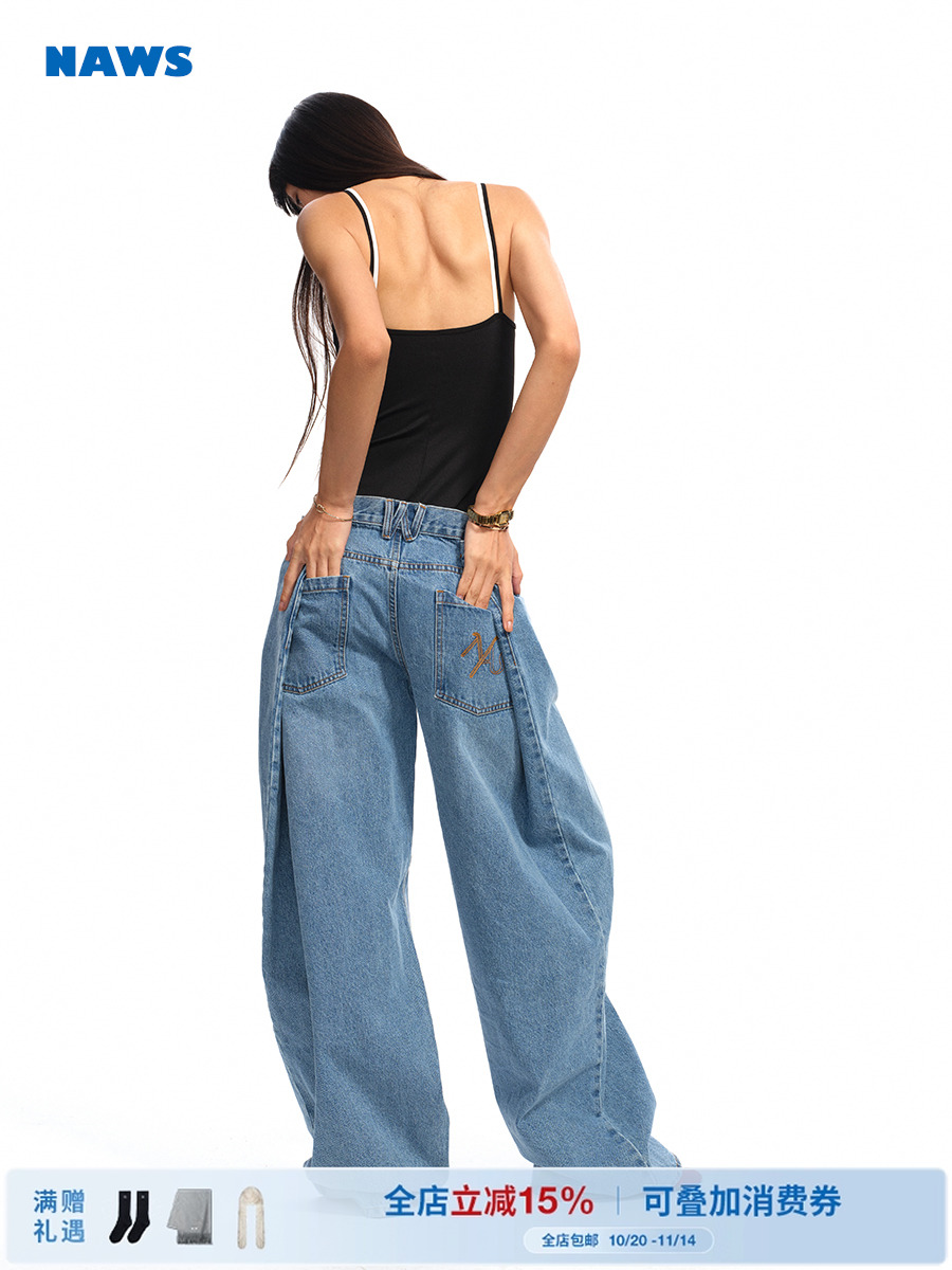 Naws【Same Style as Niyi】Ceramic Denim Baggy Pants Washed Reverse Pocket Wide Leg Jeans Long Pants