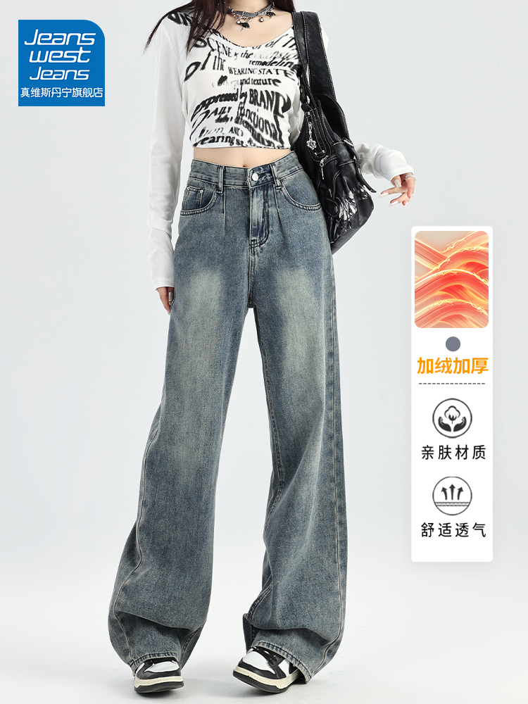 Jeans Retro Fleece-Lined Wide-Leg Jeans for Women, Winter Casual Loose Straight-Leg Floor-Length Pants