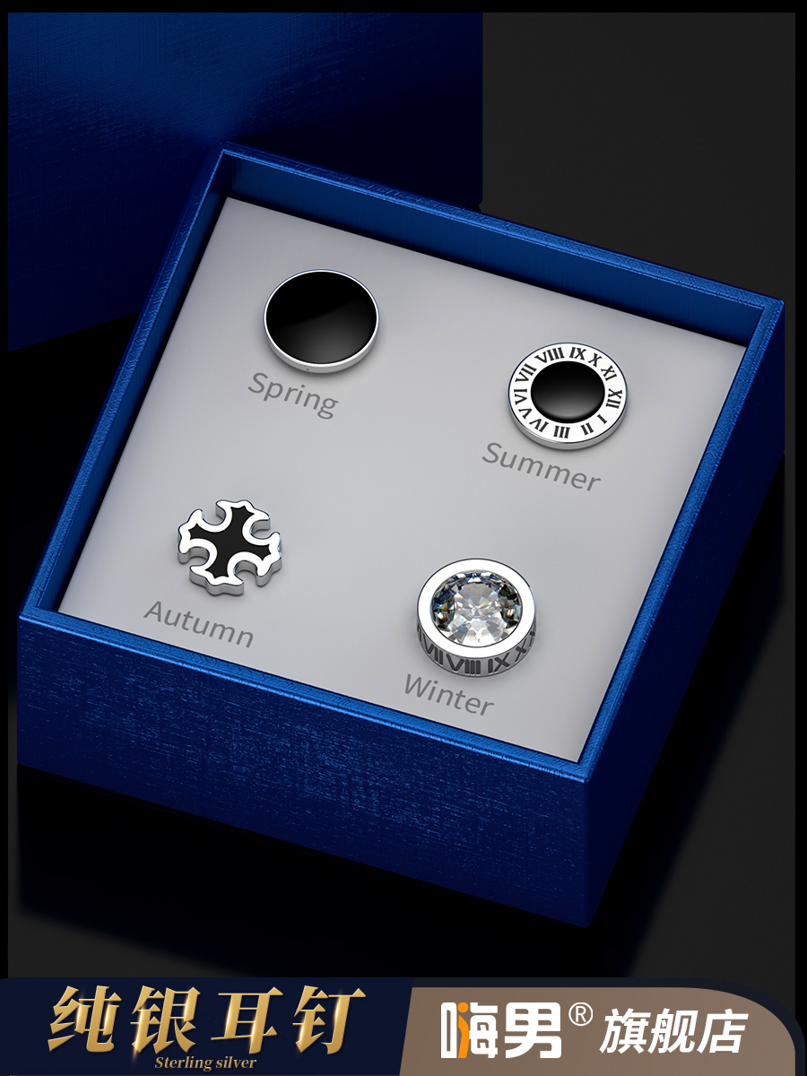 Sterling Silver Earrings for Men, High-End Men's Earrings, Unique Black Ear Piercing, Single Earring, Popular Trendy Men's Simple Style