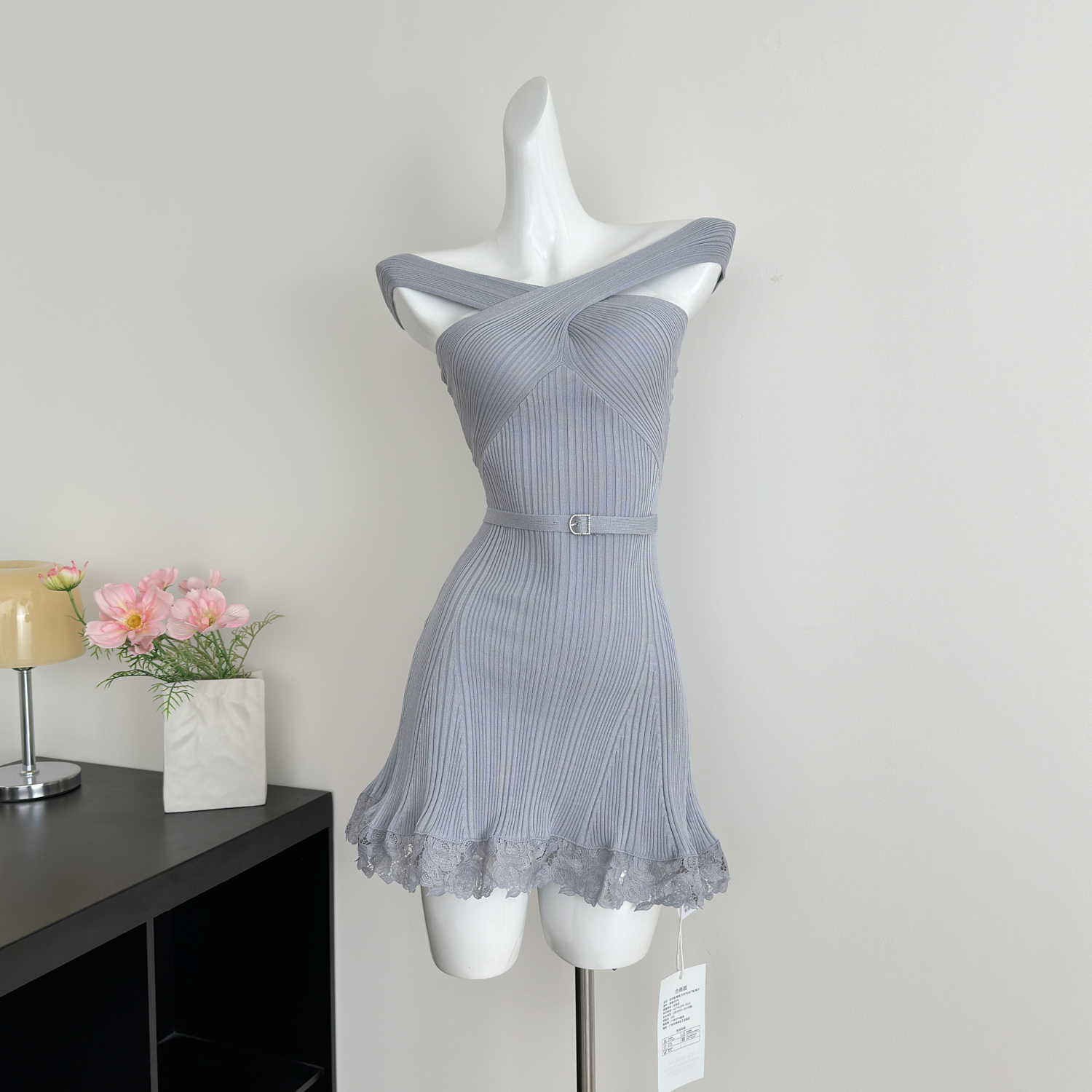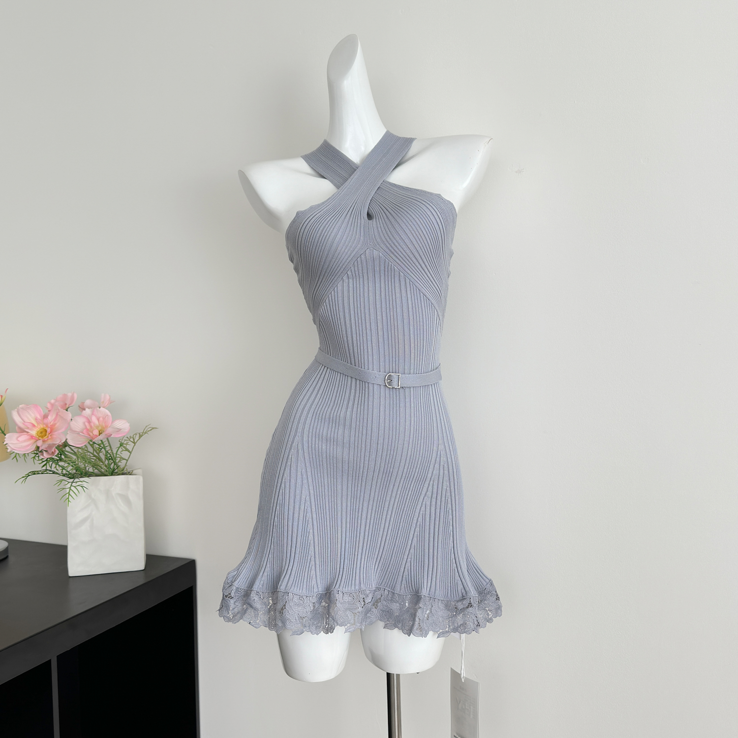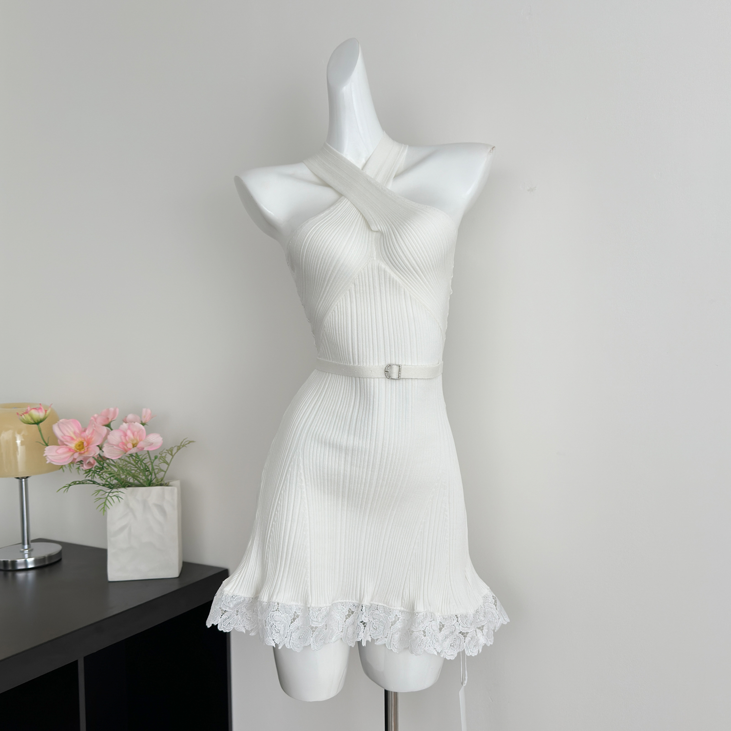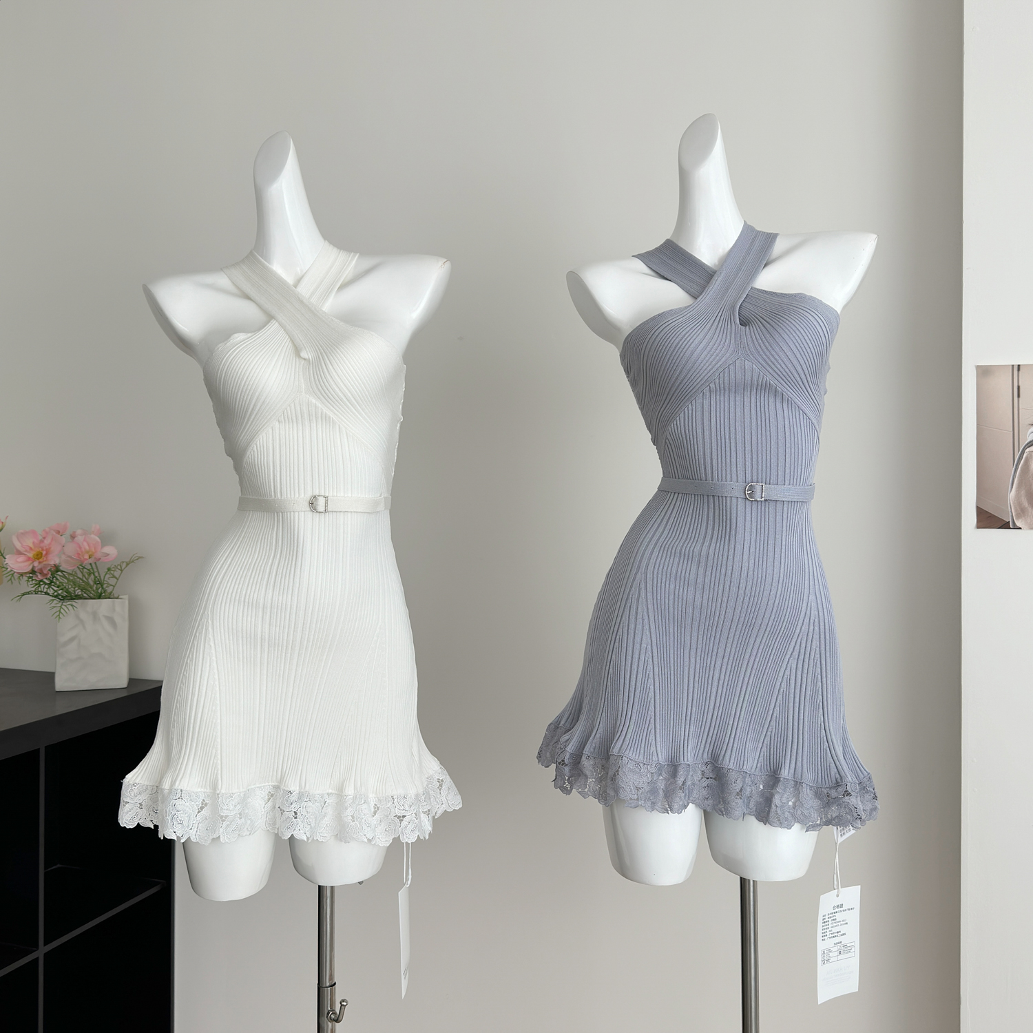 Youni LAOSHU Gentle Lace Splicing Knitted Twist Dress with Criss-Cross Straps and Slim Fit Short Skirt