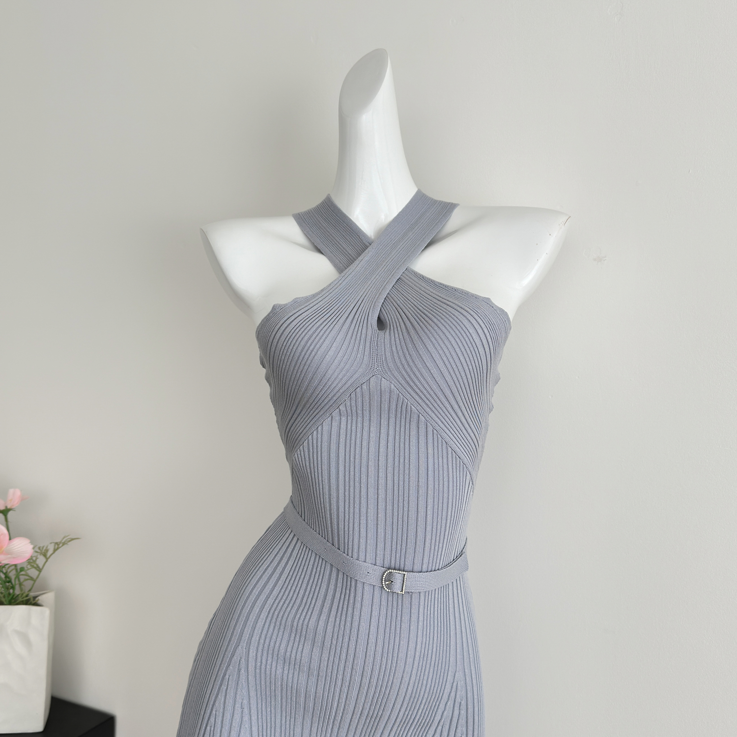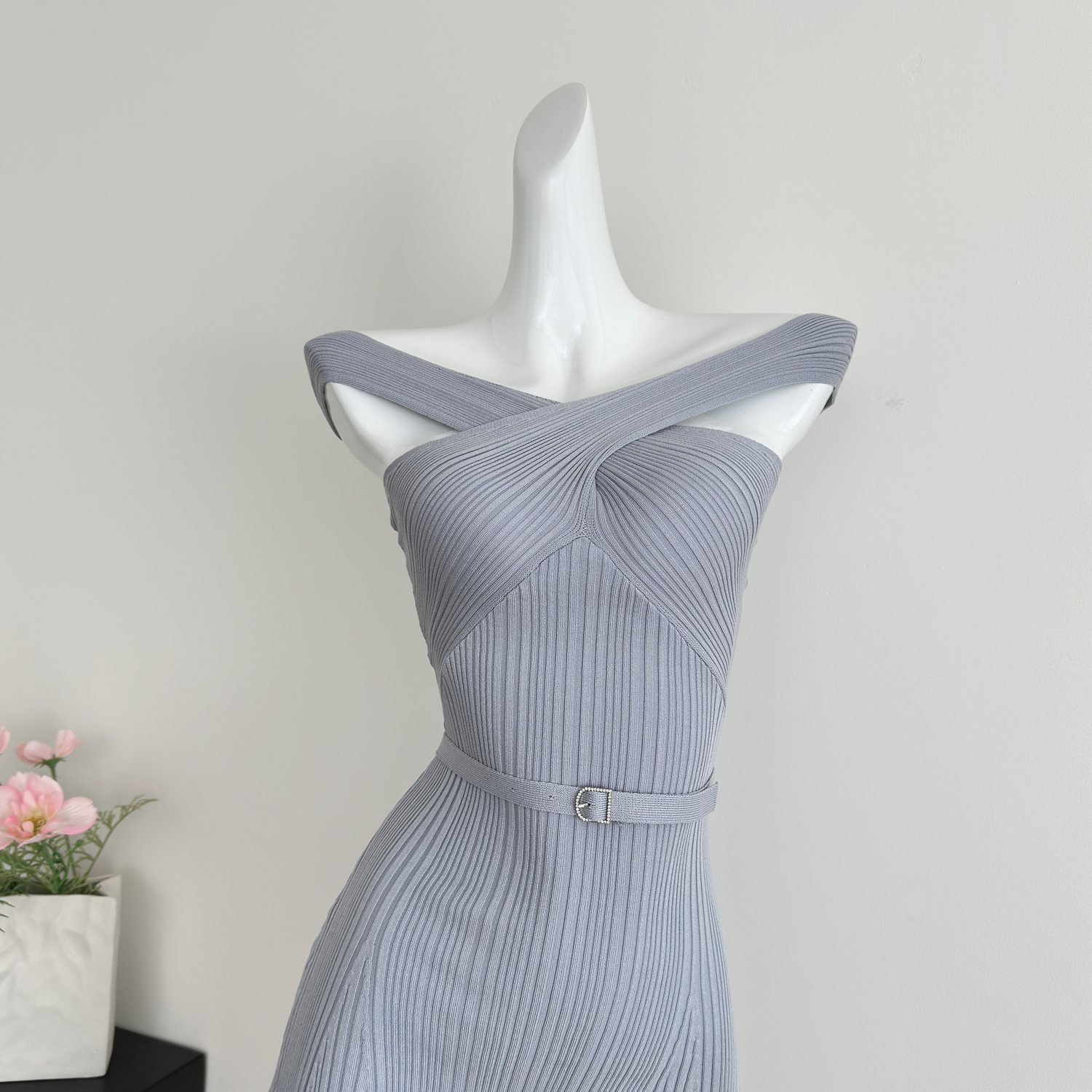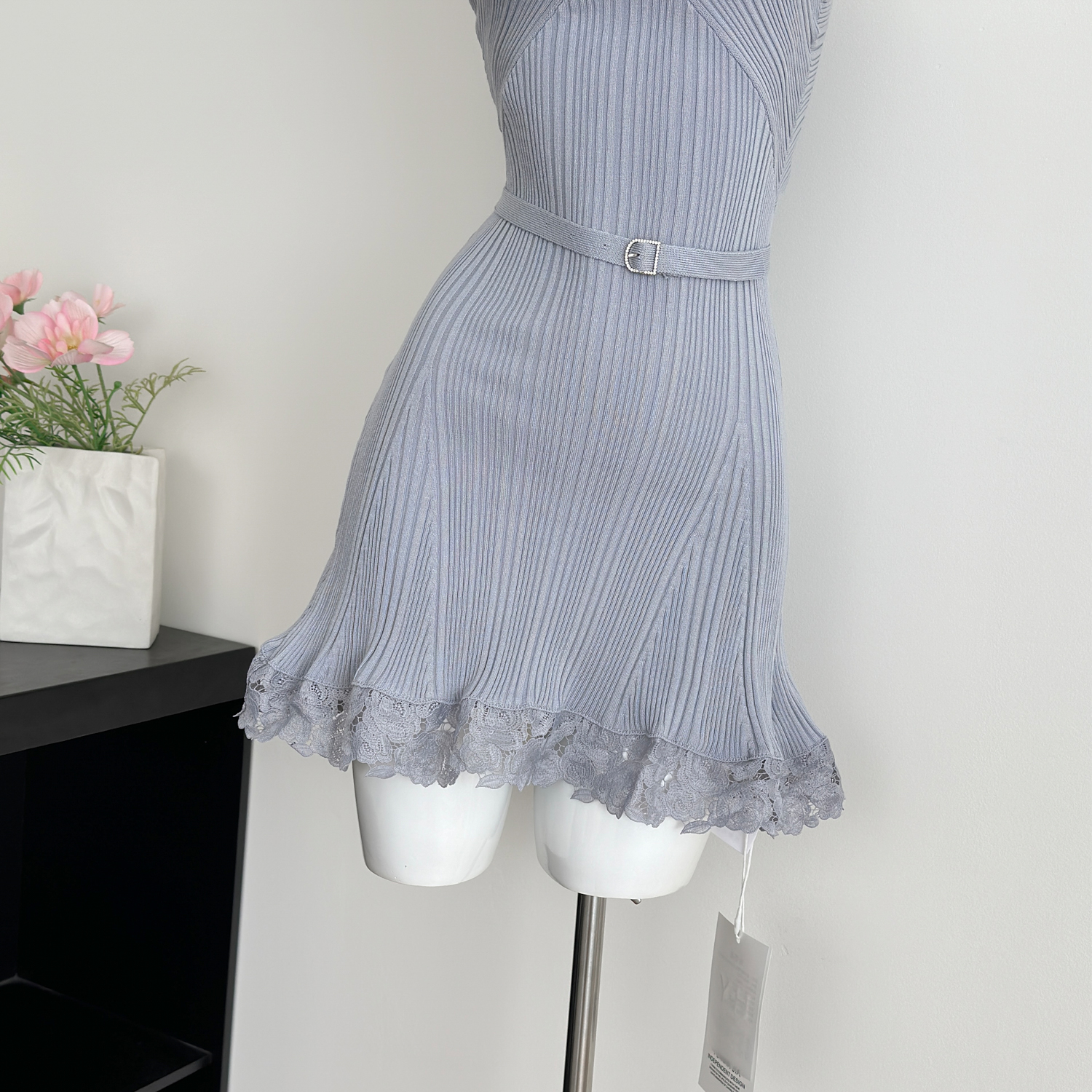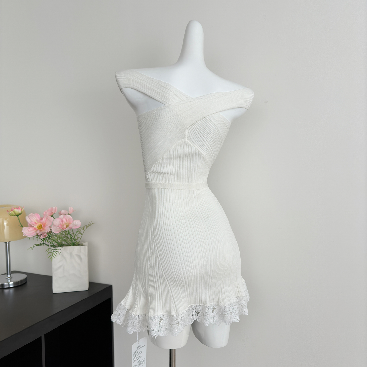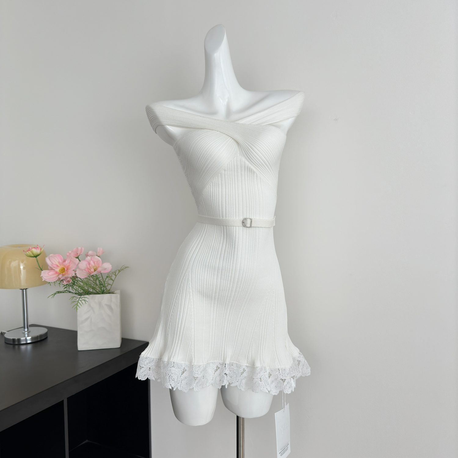 Youni LAOSHU Gentle Lace Splicing Knitted Twist Dress with Criss-Cross Straps and Slim Fit Short Skirt