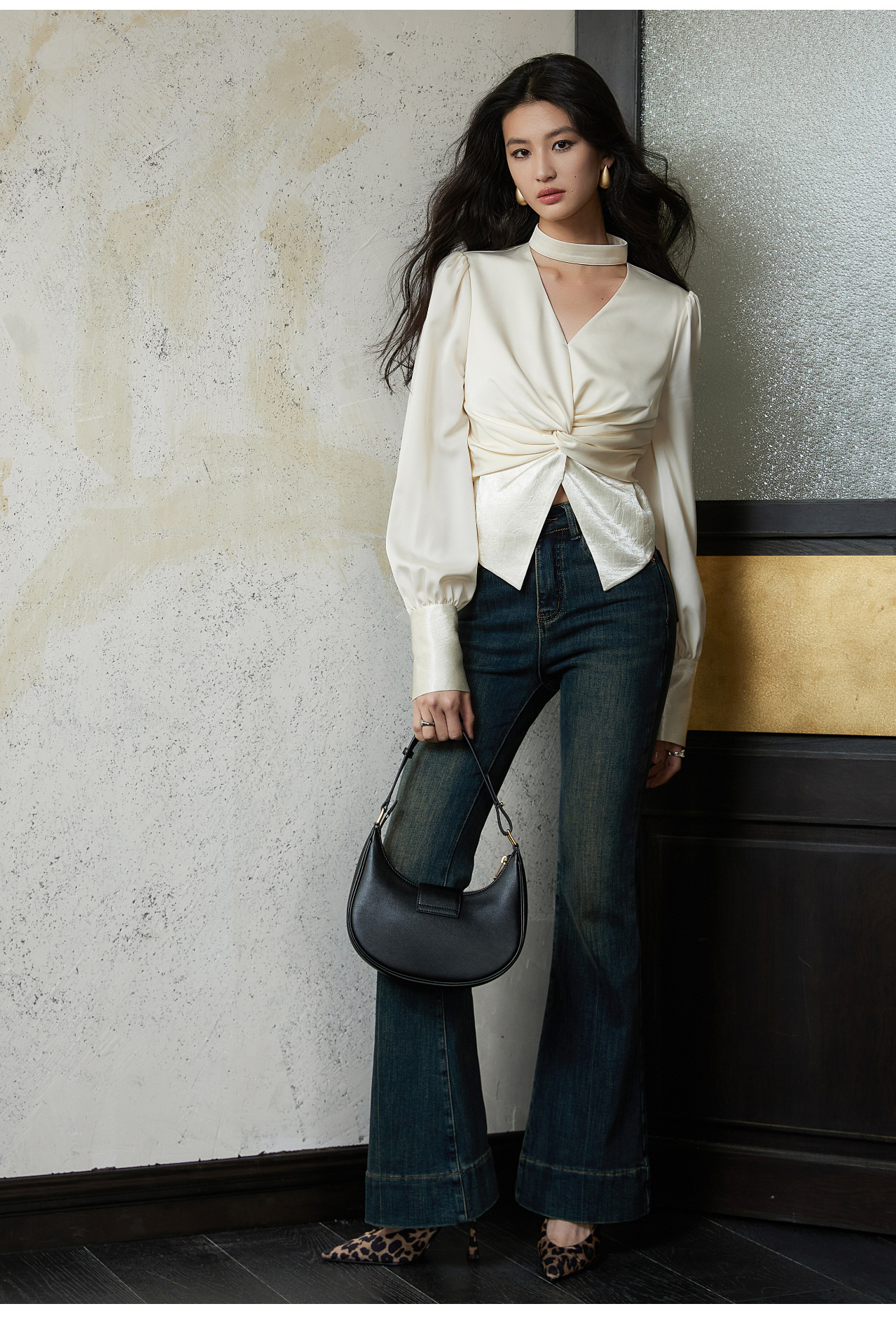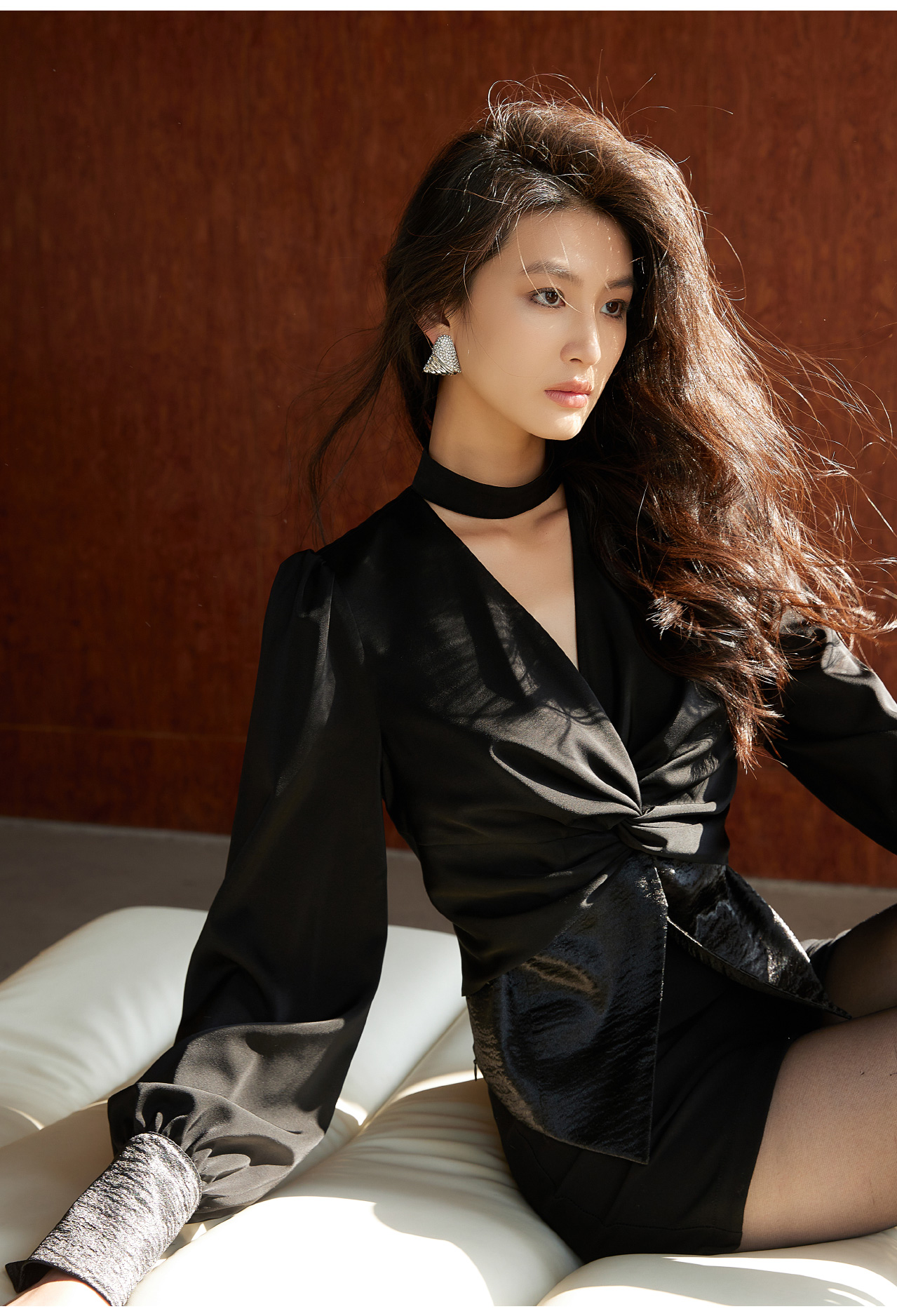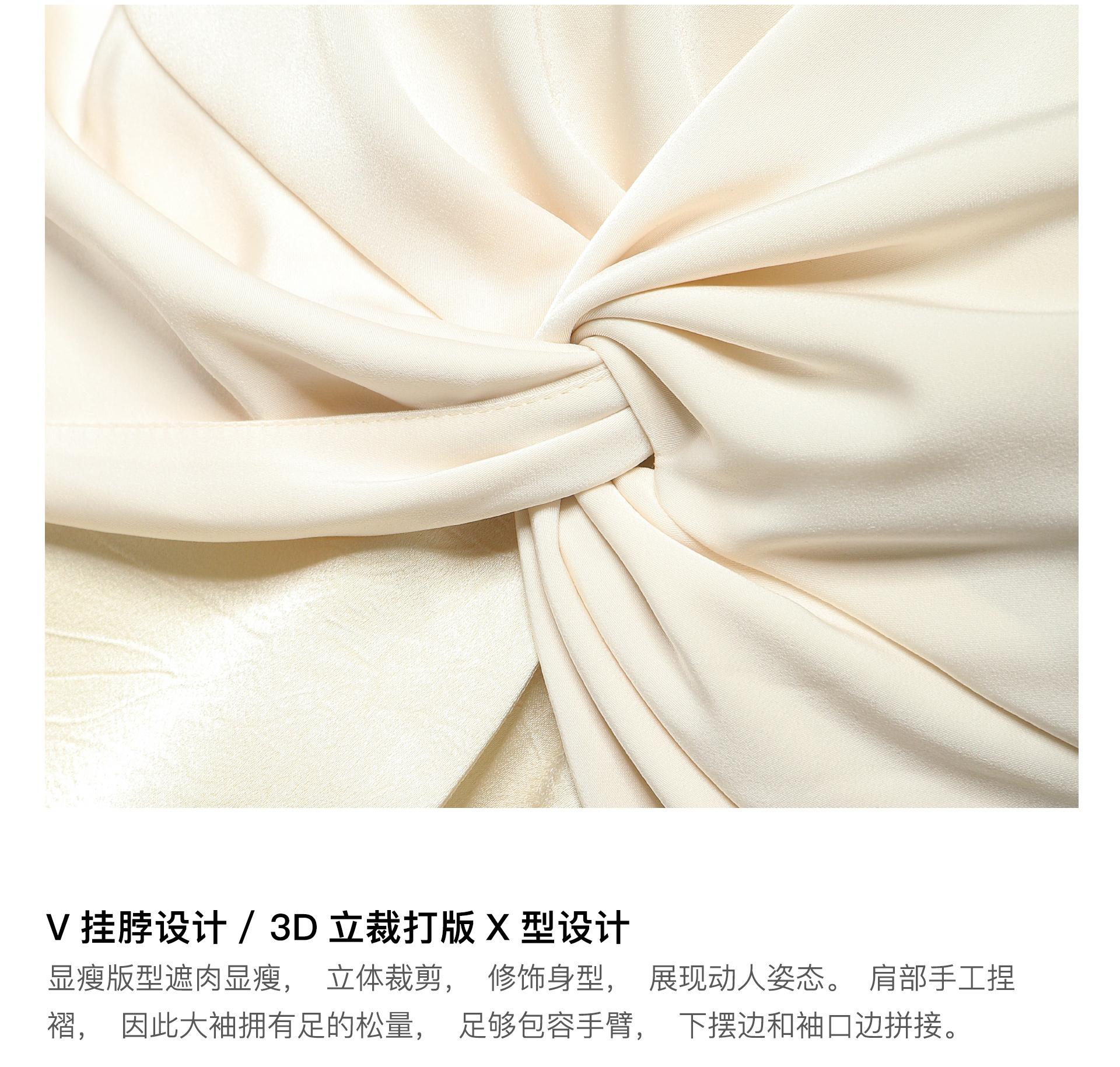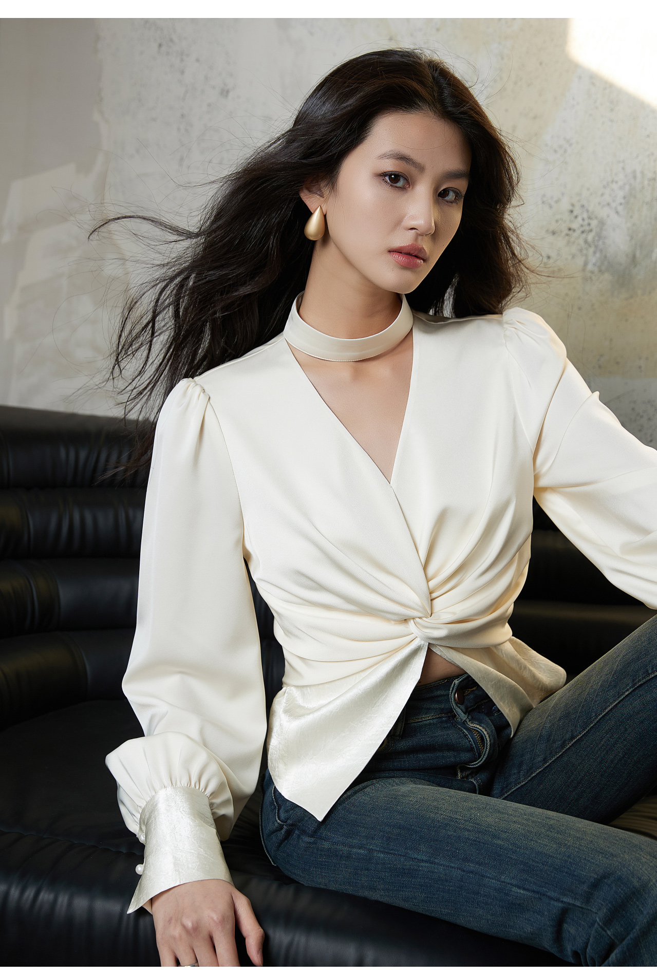 Wangxo丨High-End Matte Satin丨V-Neck Halter Neck Waist-Cinching Design Long-Sleeve Shirt for Women