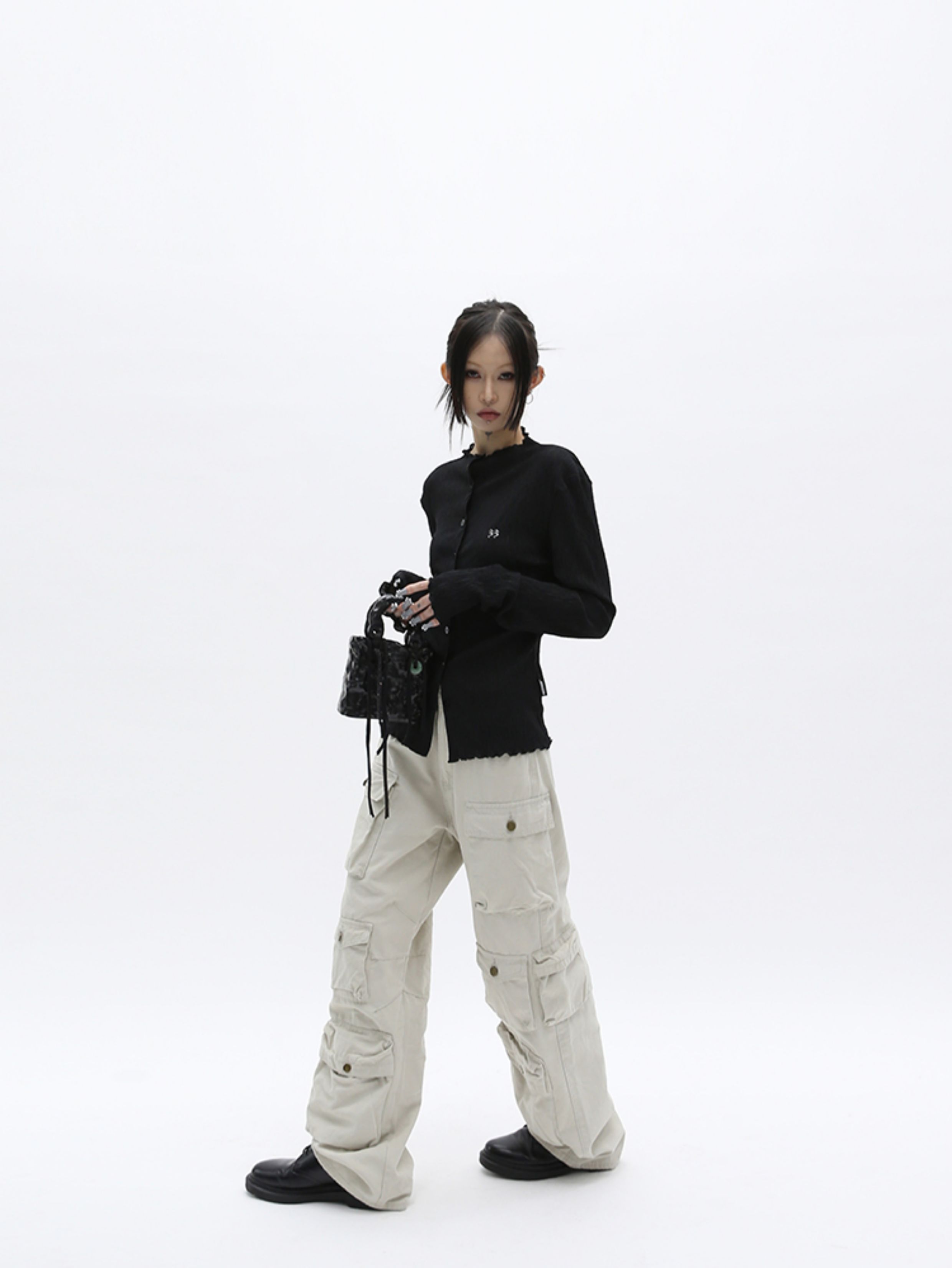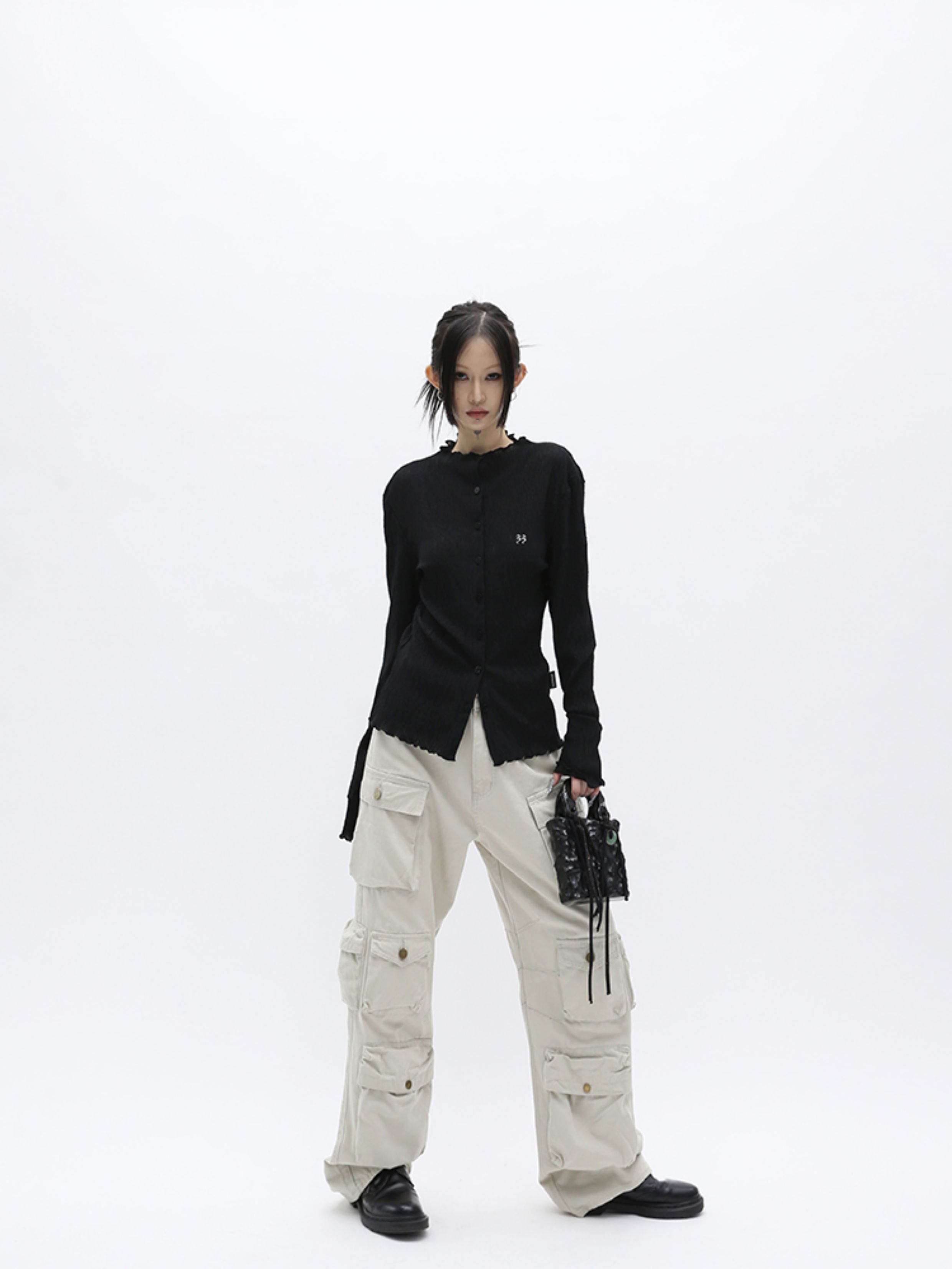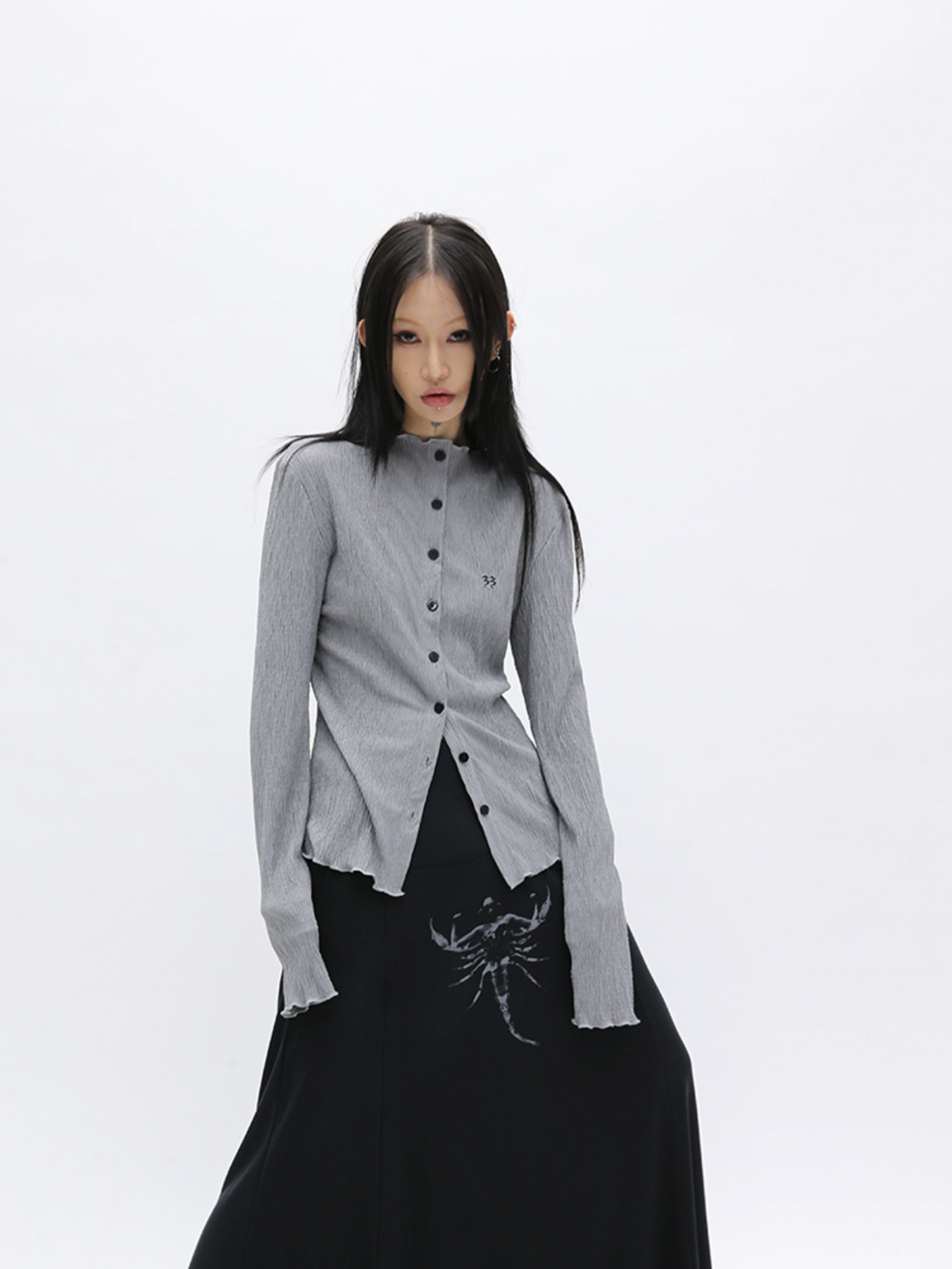 Meiya Fuzzykon Original Design Logo Embroidery Spring and Autumn Lightweight Cardigan Pleated Long-Sleeve Jacket Black/Grey