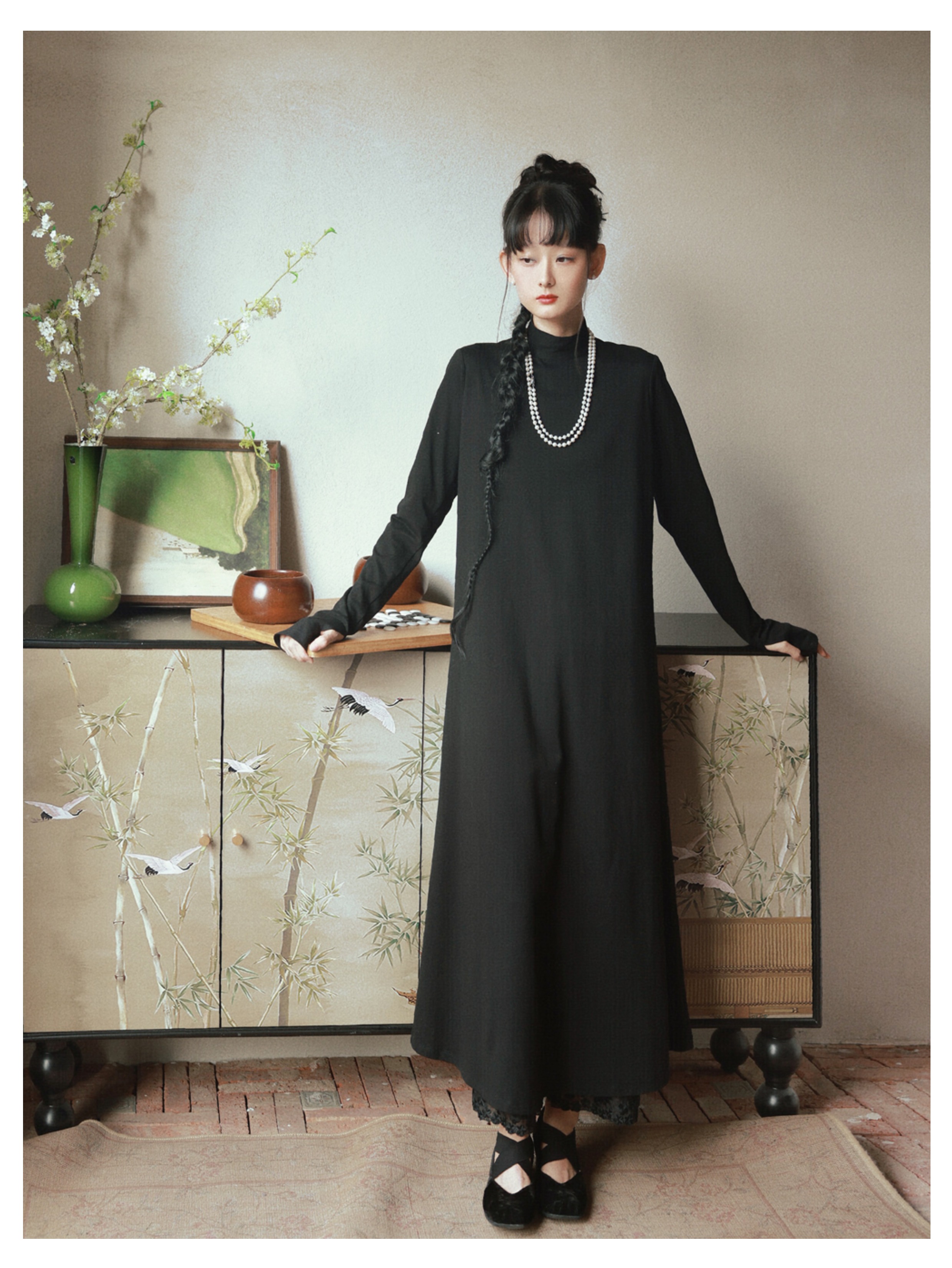 Charmmy Ye 24A/W Versatile Black Knitted Stand-Up Collar Dress New Chinese Style Mid-High Collar Base Dress