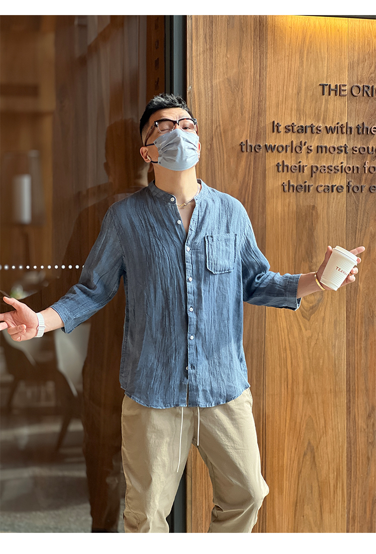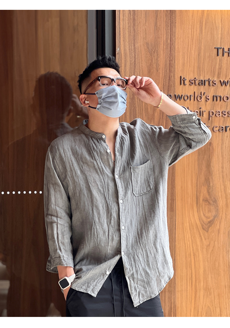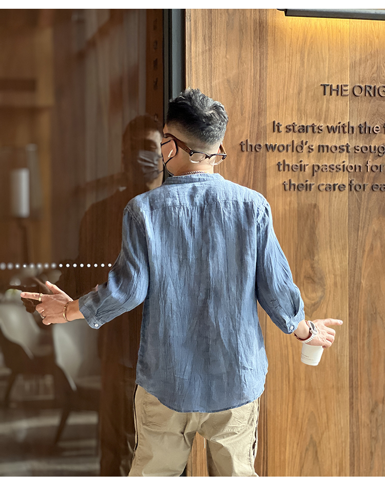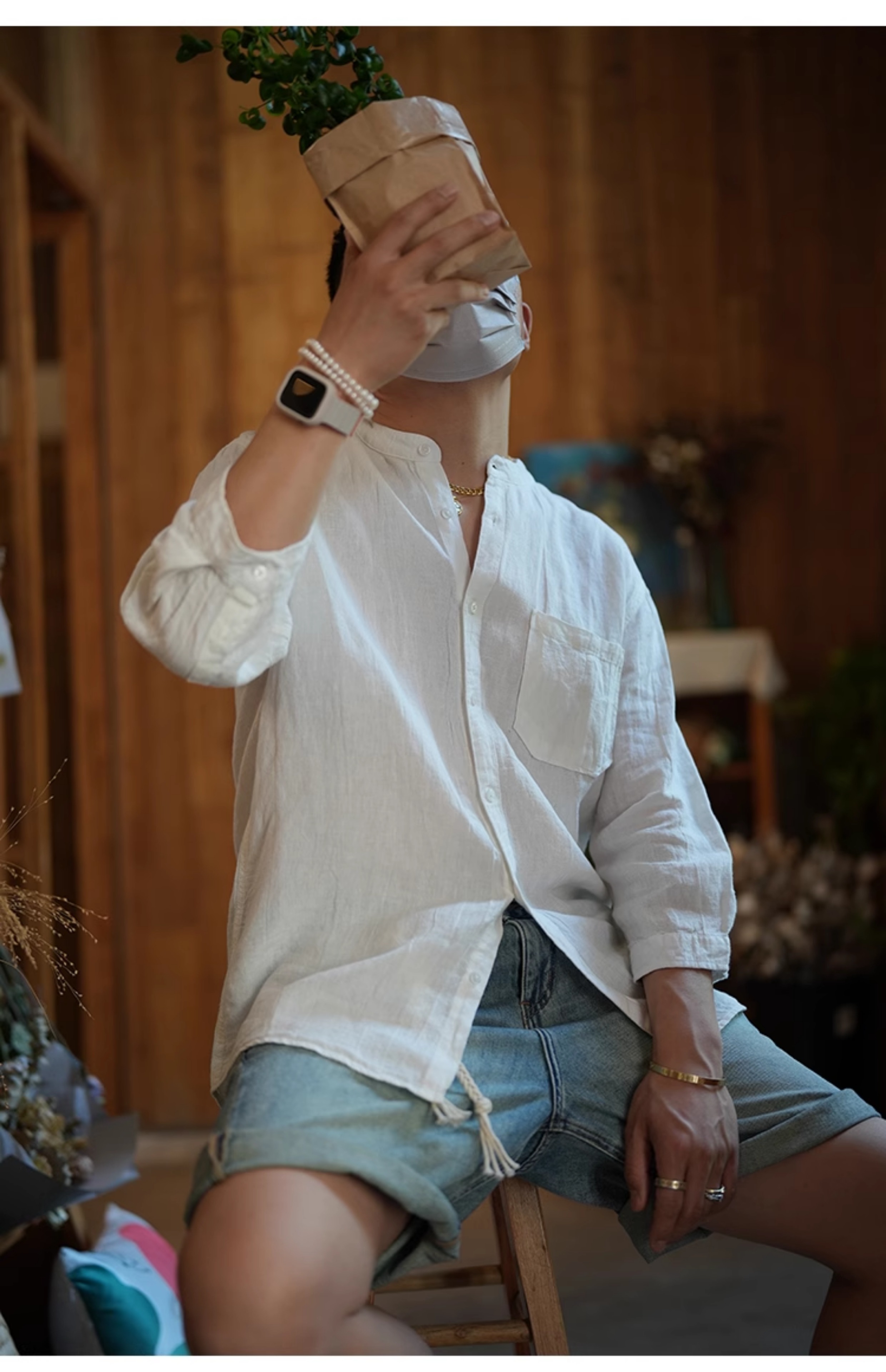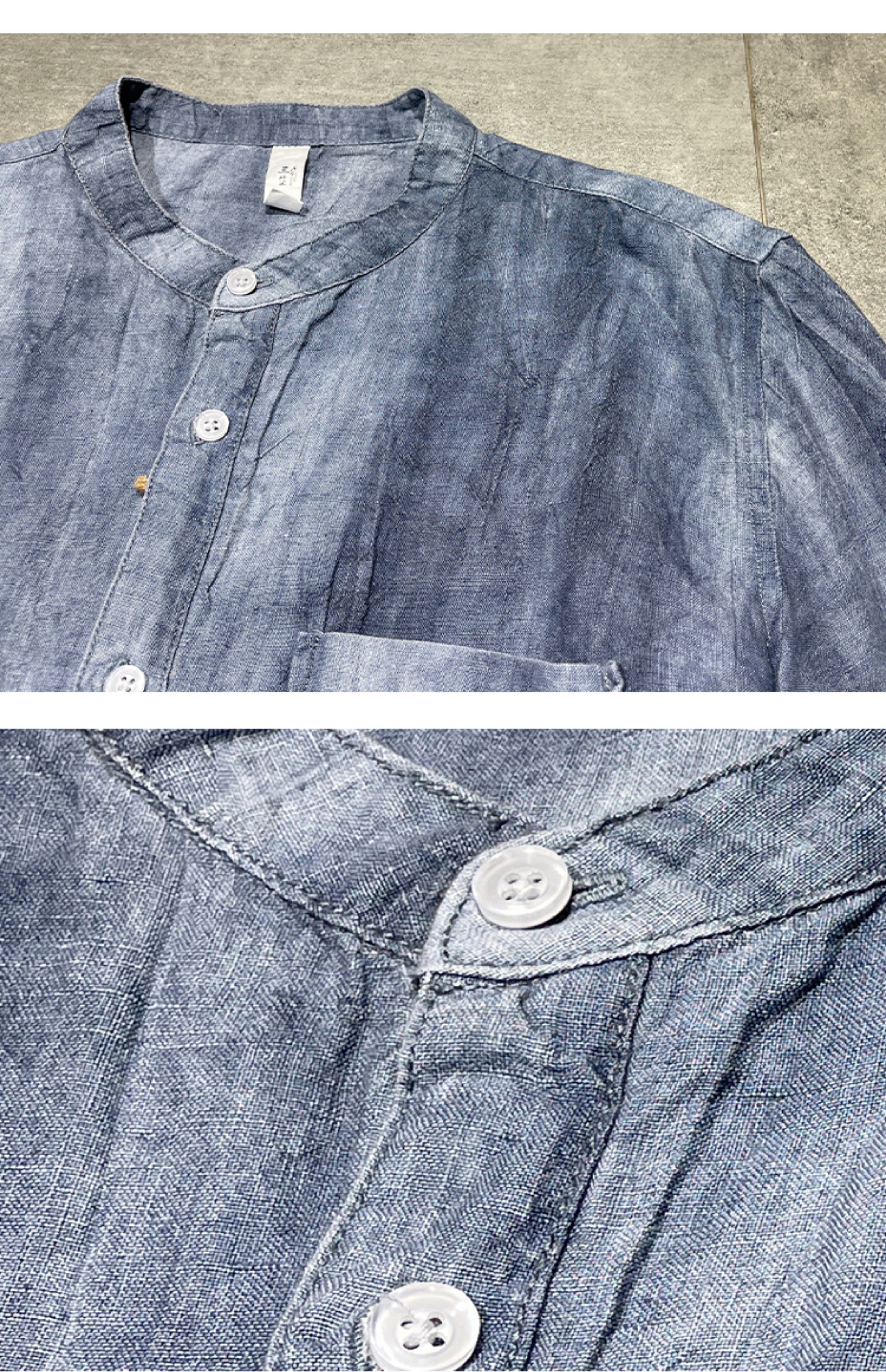 Korean Style Casual Summer Breathable Linen High-End Tie-Dye Three-Quarter Sleeve Shirt Retro Stand Collar Loose Top for Men