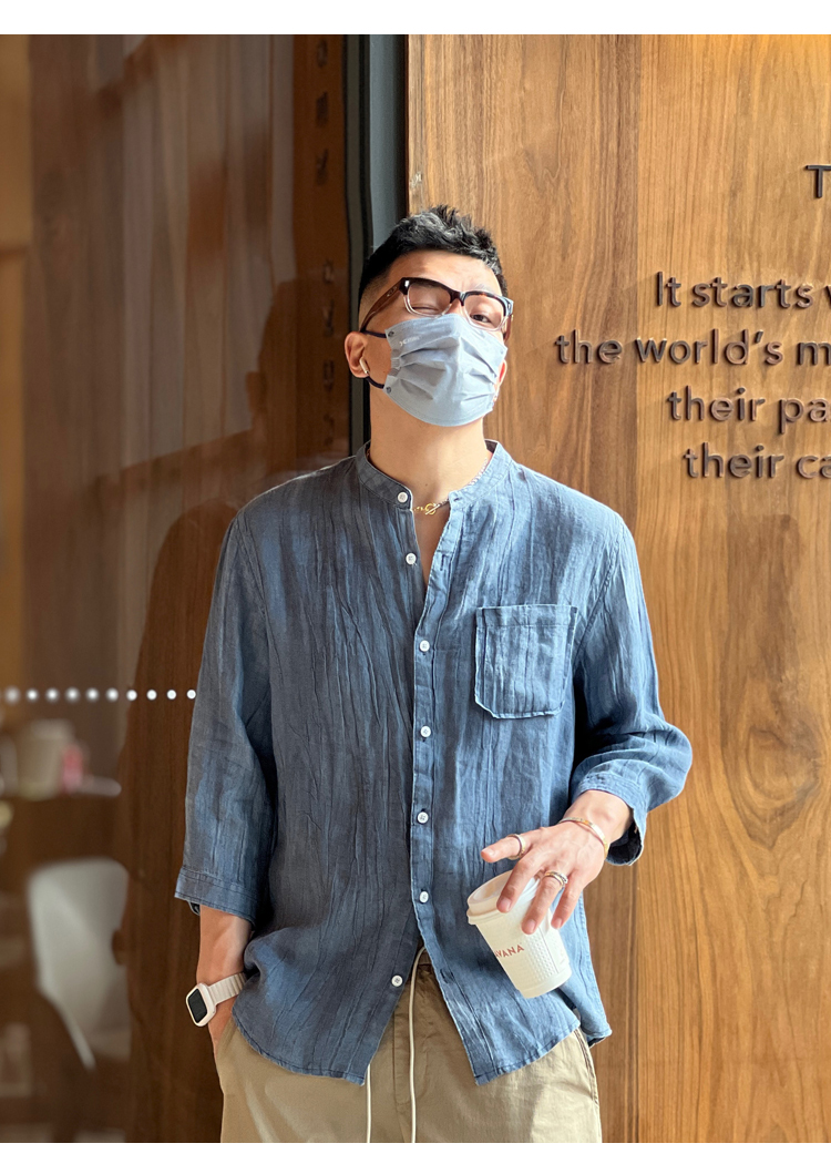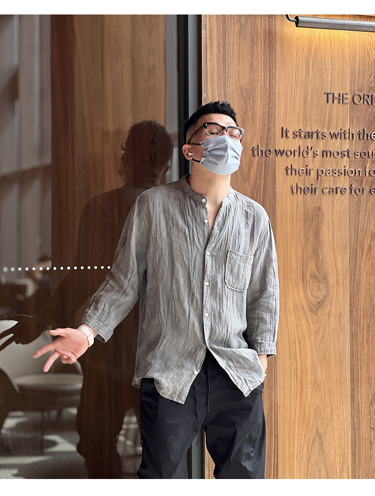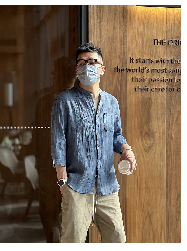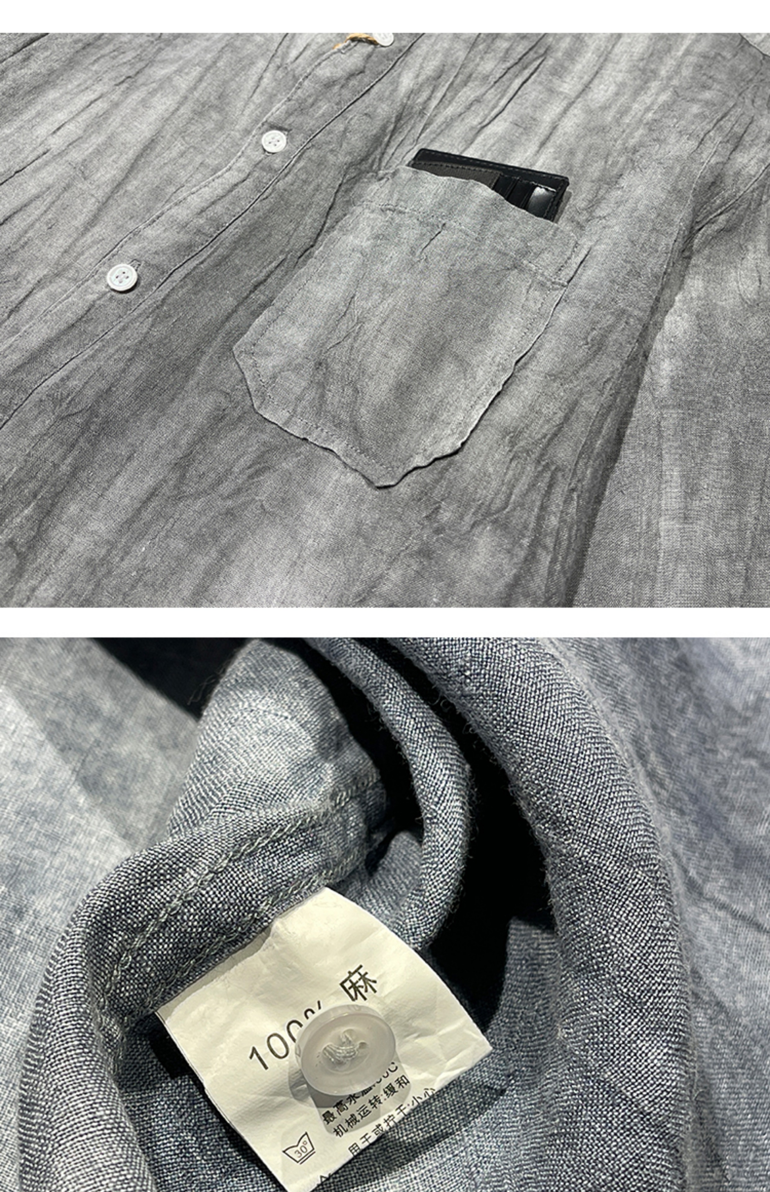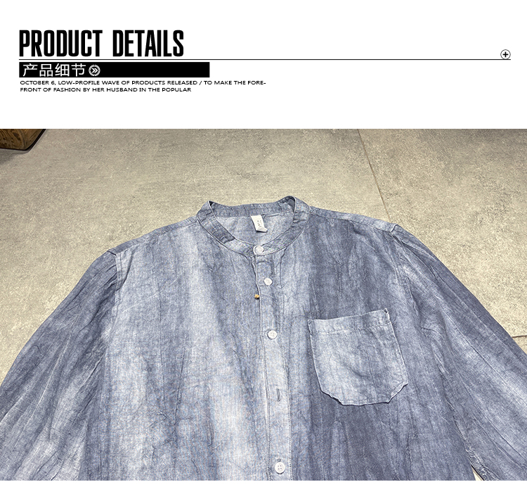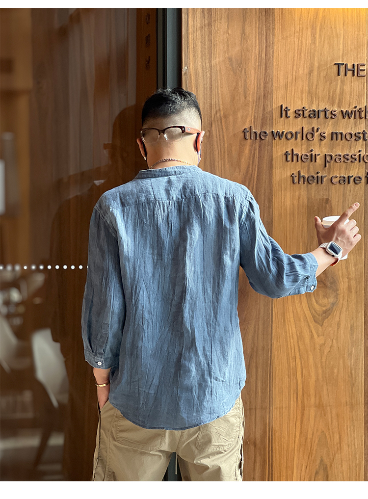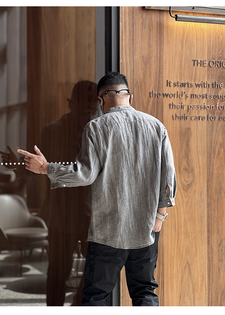 Korean Style Casual Summer Breathable Linen High-End Tie-Dye Three-Quarter Sleeve Shirt Retro Stand Collar Loose Top for Men