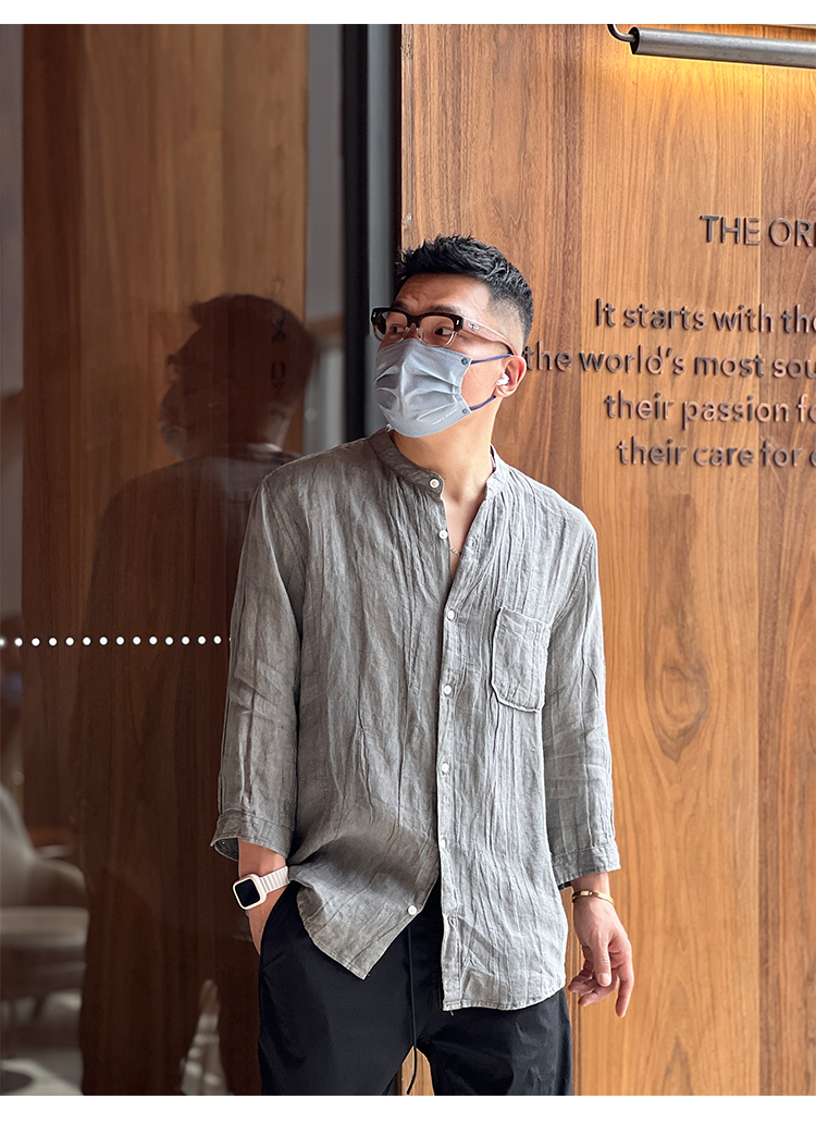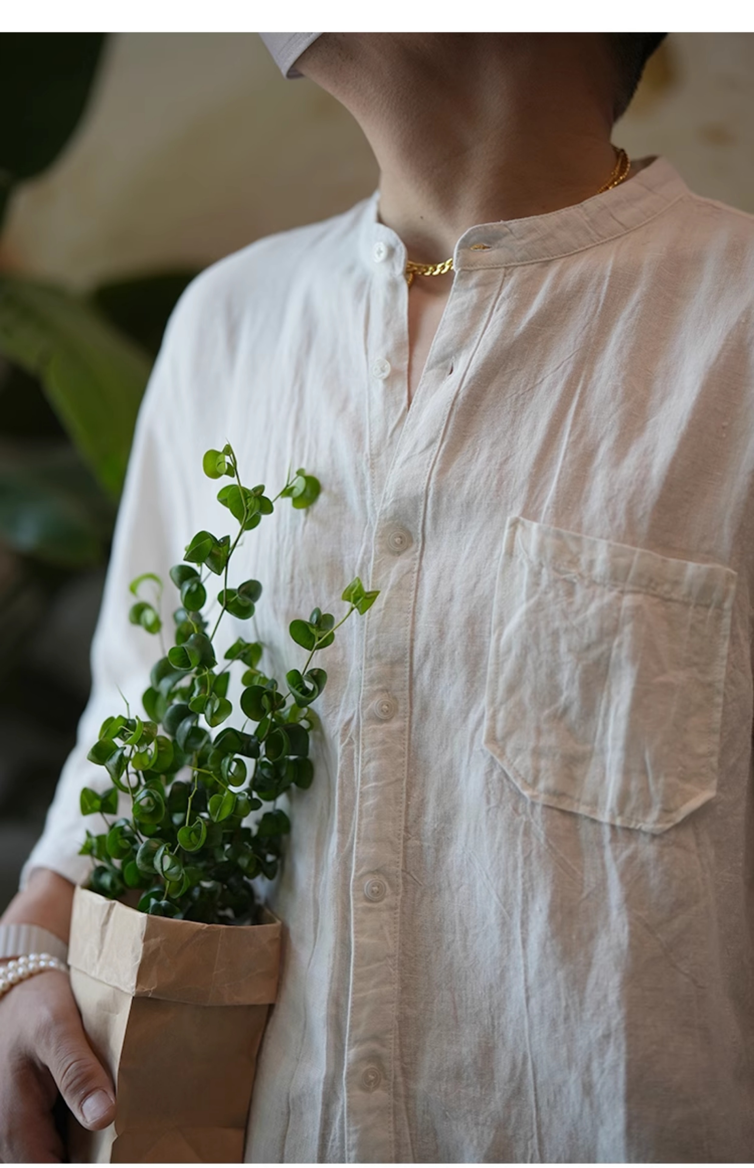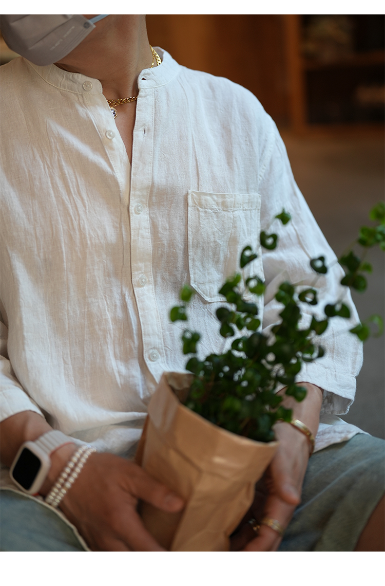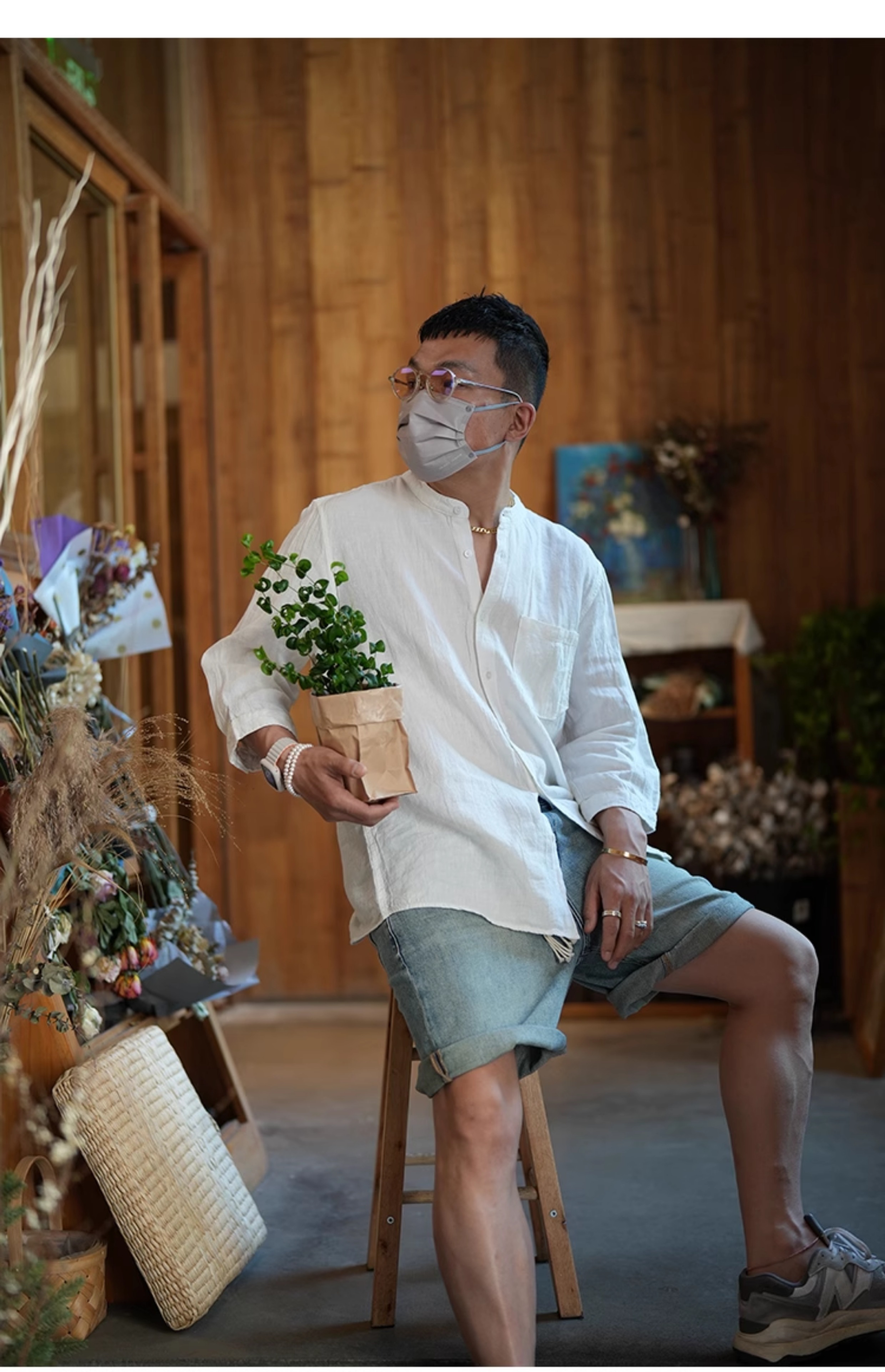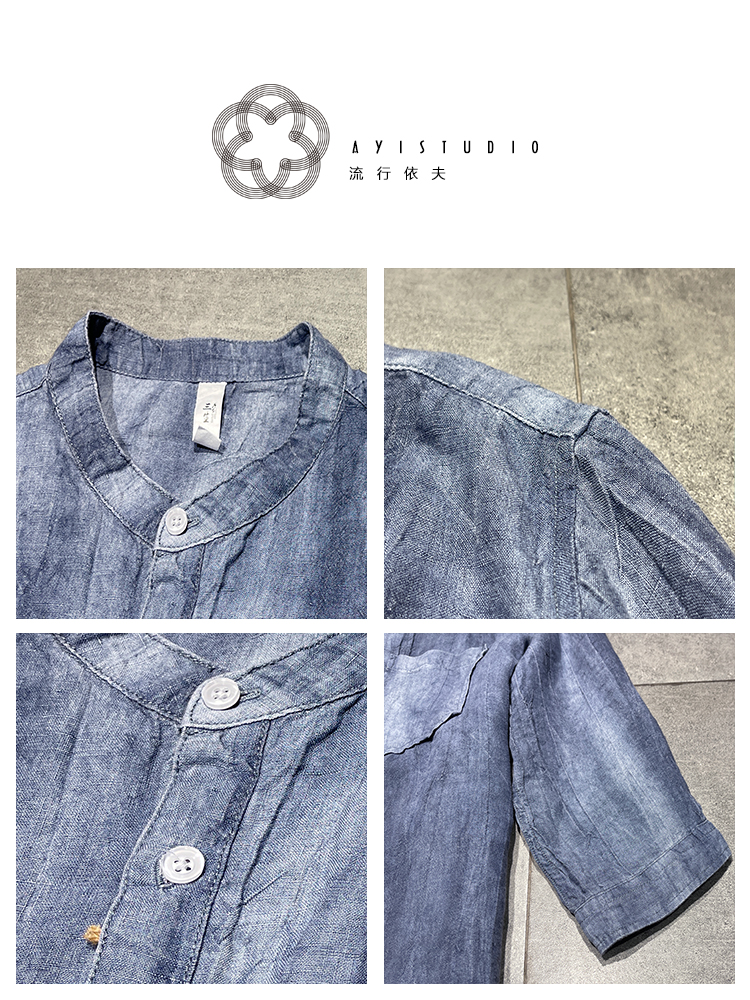 Korean Style Casual Summer Breathable Linen High-End Tie-Dye Three-Quarter Sleeve Shirt Retro Stand Collar Loose Top for Men