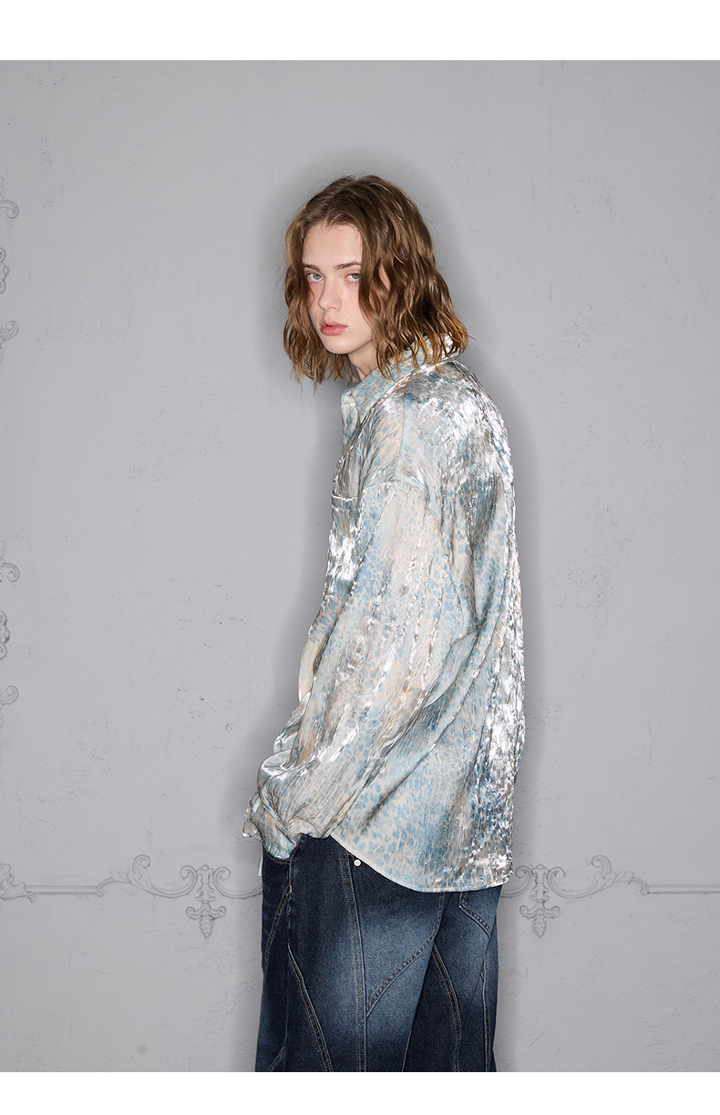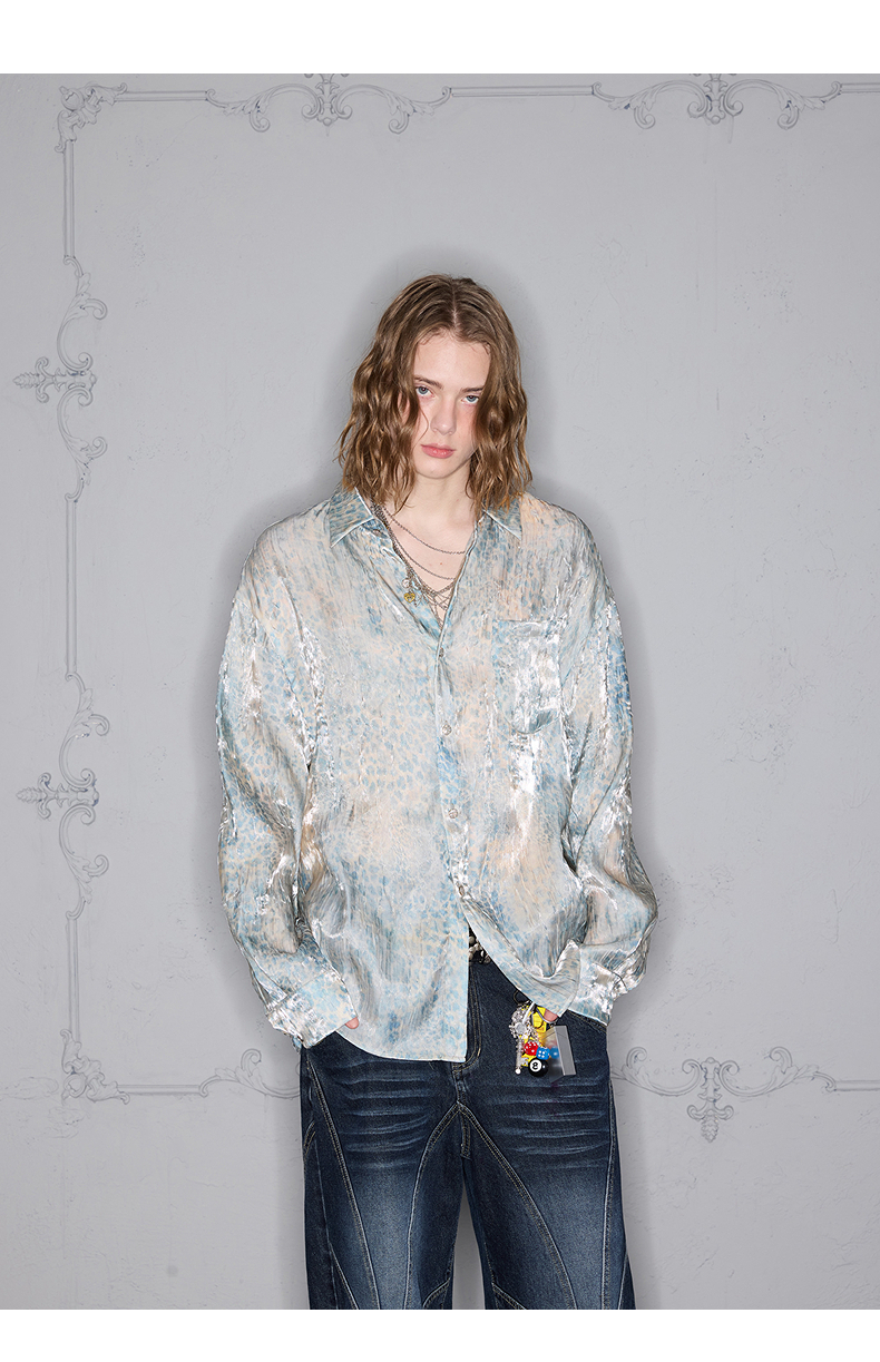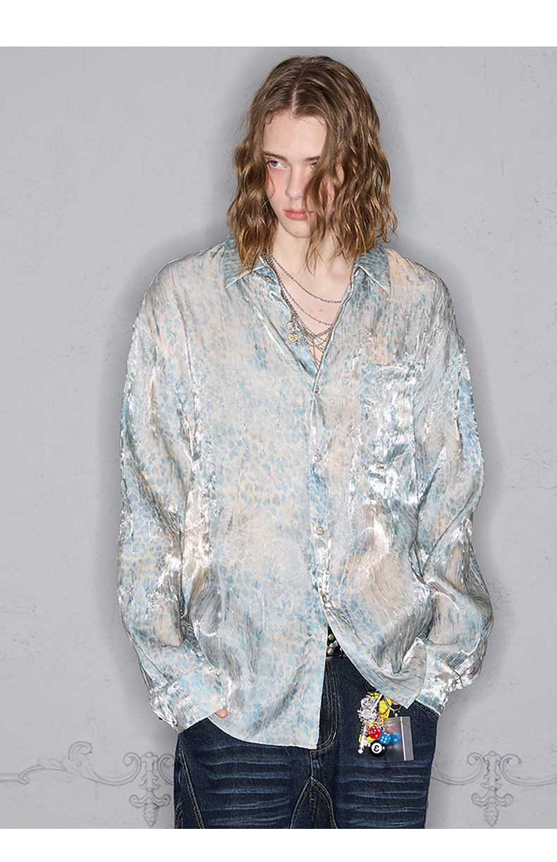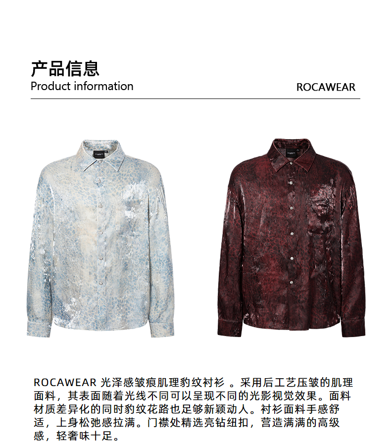 [Ziyu Same Model] Rocawear Glossy Wrinkle Texture Draping Men's and Women's Leopard Print Lapel Long sleeves Shirt Tide