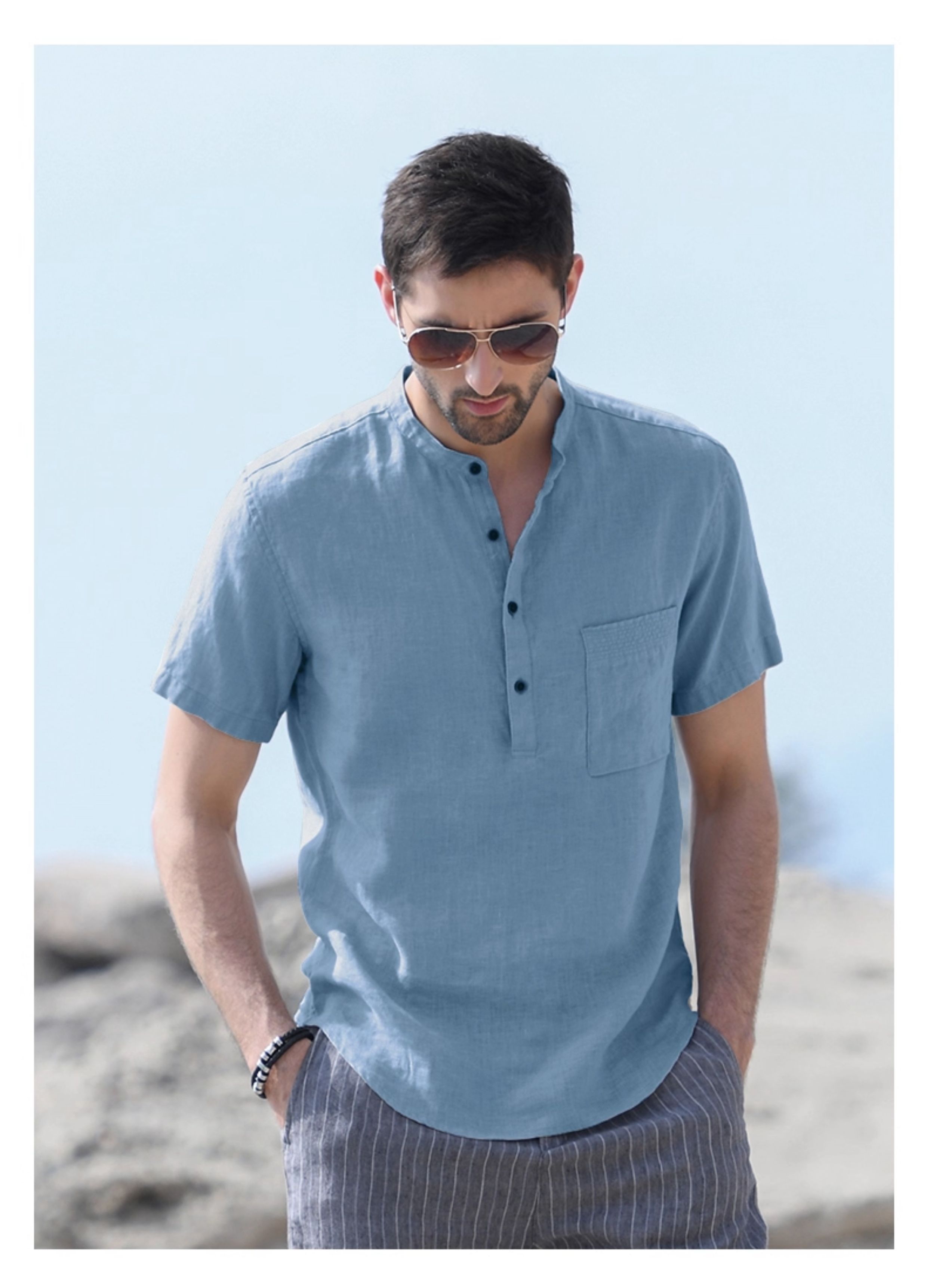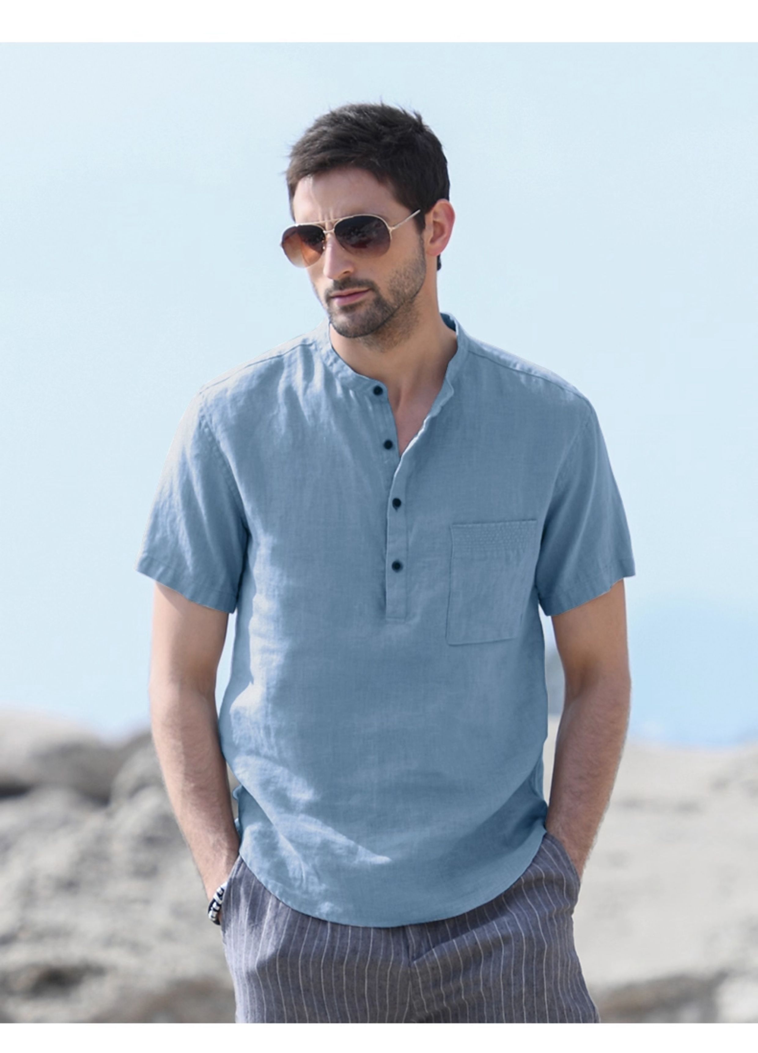 Hanxu Soft and Breathable Short-Sleeved Linen Shirt for Men, Artistic Casual Loose Top, Thin Stand-Up Collar Linen Shirt