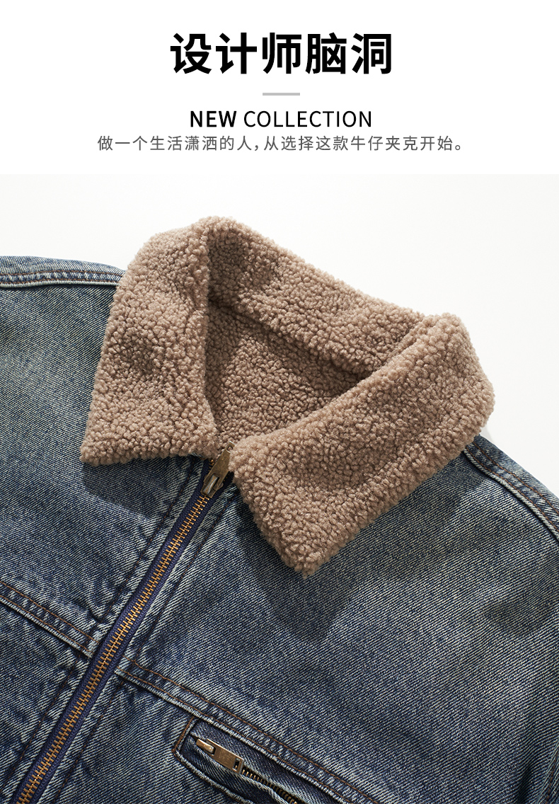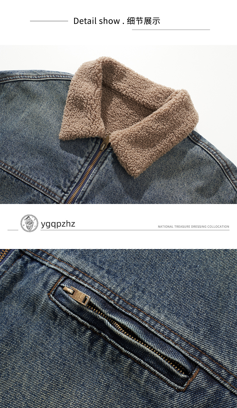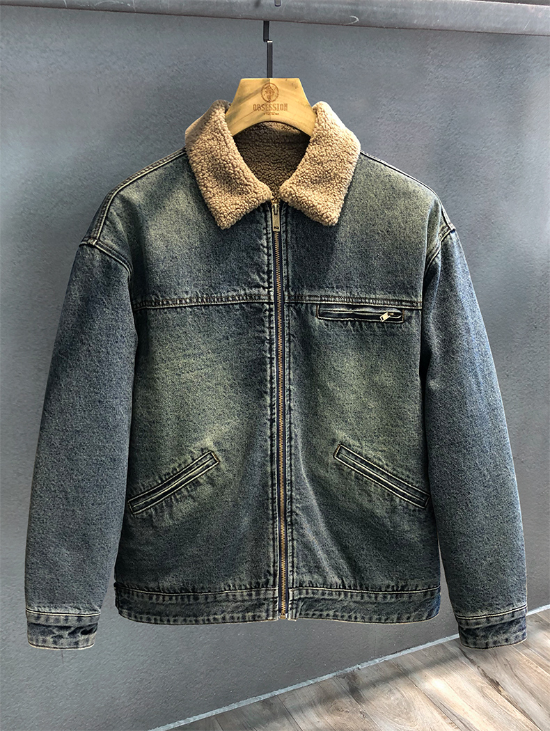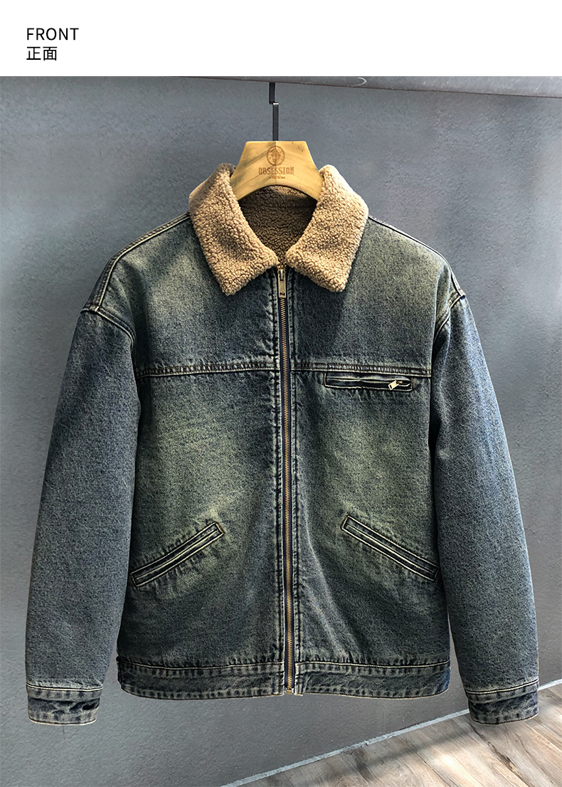 Detroit Motorcycle Vintage Washed Lamb Wool Thickened Denim Jacket Men's Winter Fleece-Lined Lapel American-Style Jacket