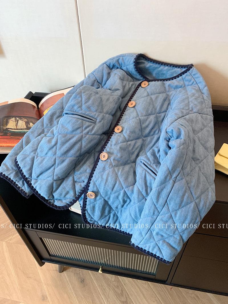Blue Round-Neck Single-Breasted Denim Quilted Cotton Jacket for Women, Autumn and Winter 2025 New Vintage Loose Warm Top
