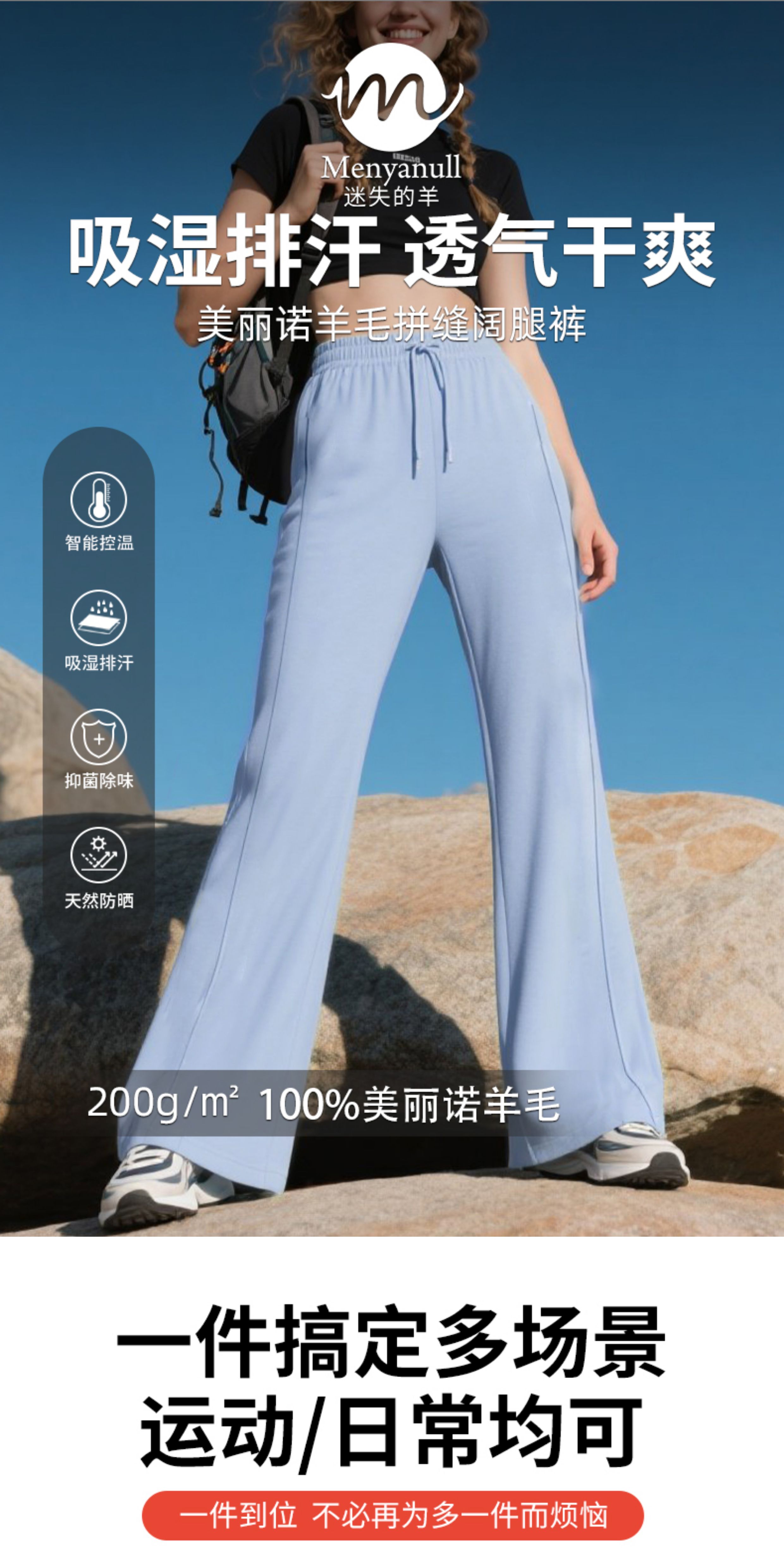 Lost Sheep Merino Wool Spring and Autumn Flared Wide-Leg Pants Merino 100% Wool Outdoor Sports Pants