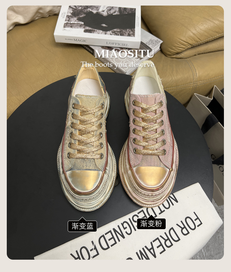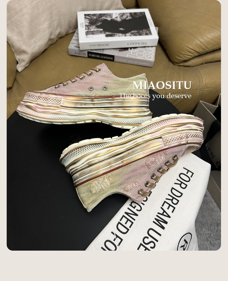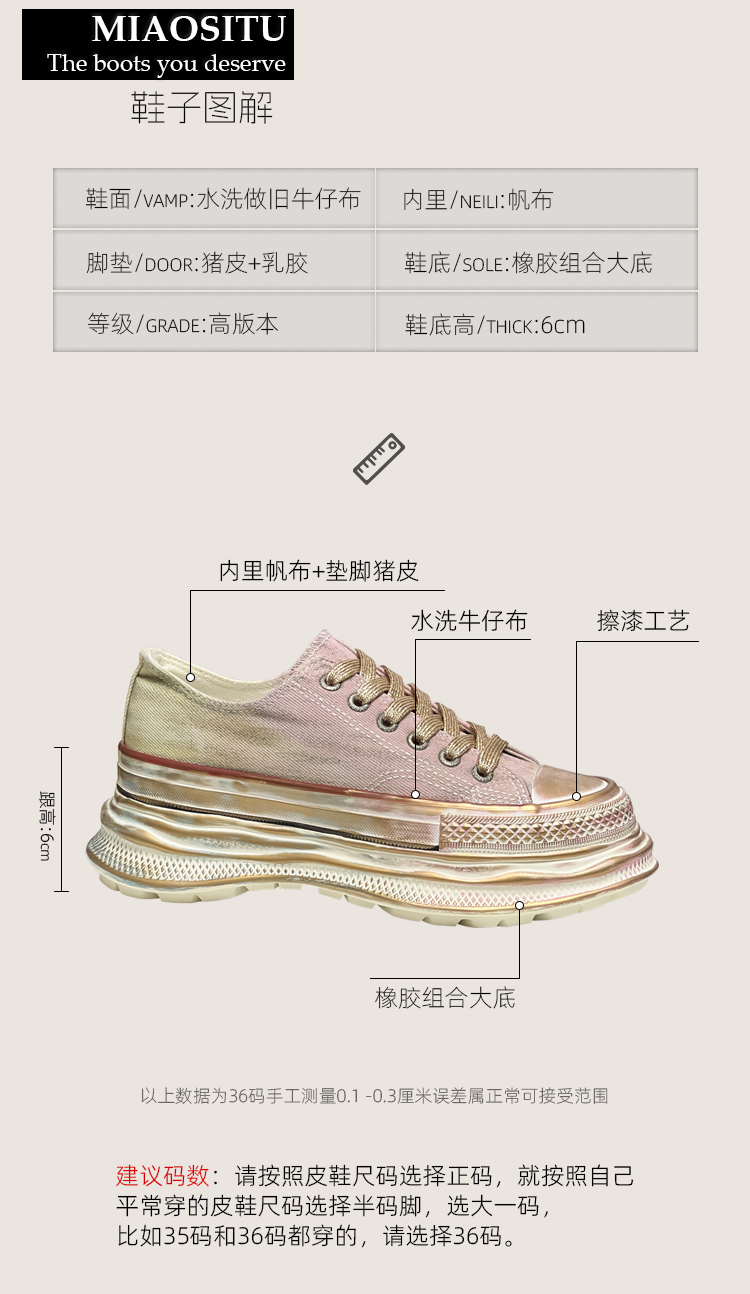 Vintage Distressed Thick-Soled Platform Canvas Shoes for Women, Hong Kong Style Niche Genuine Leather Breathable Casual Height-Increasing Dad Shoes, Distressed Shoes