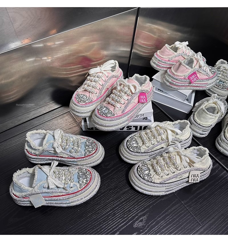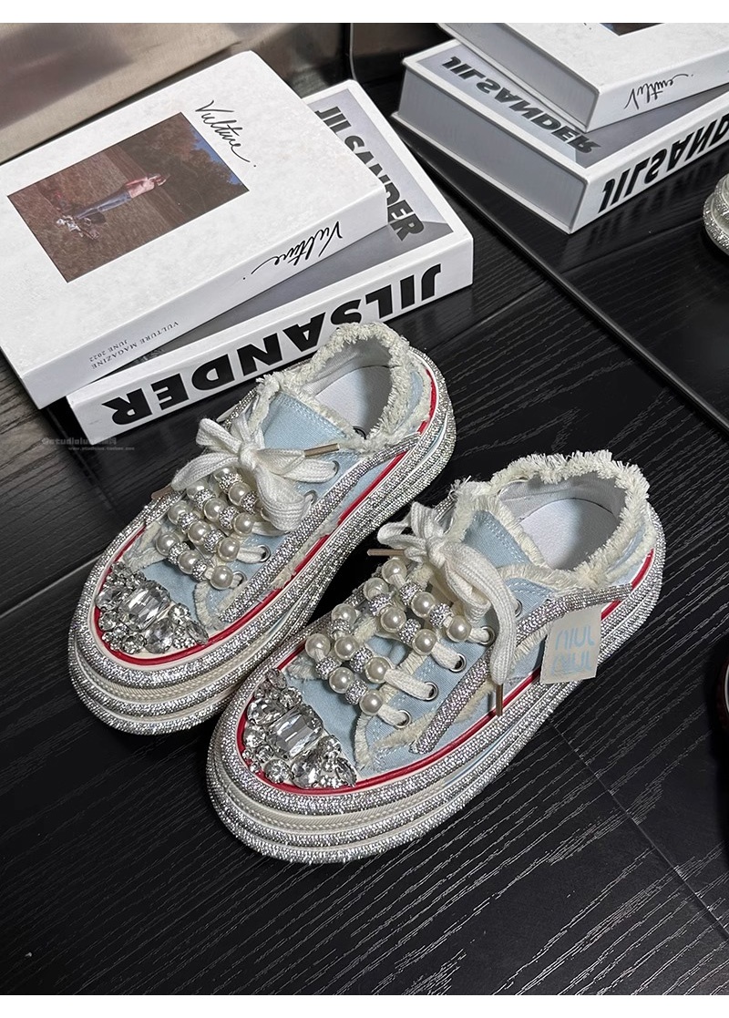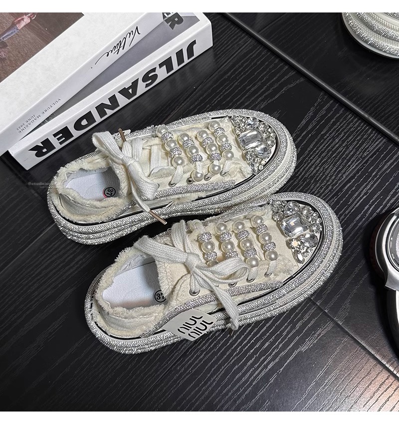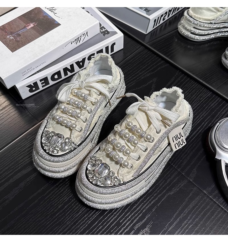 Hong Kong Rhinestone Pearl Platform Thick-Soled Canvas Shoes for Women 2025 Summer New Style Versatile Height-Increasing Casual Sneakers for Petite Individuals
