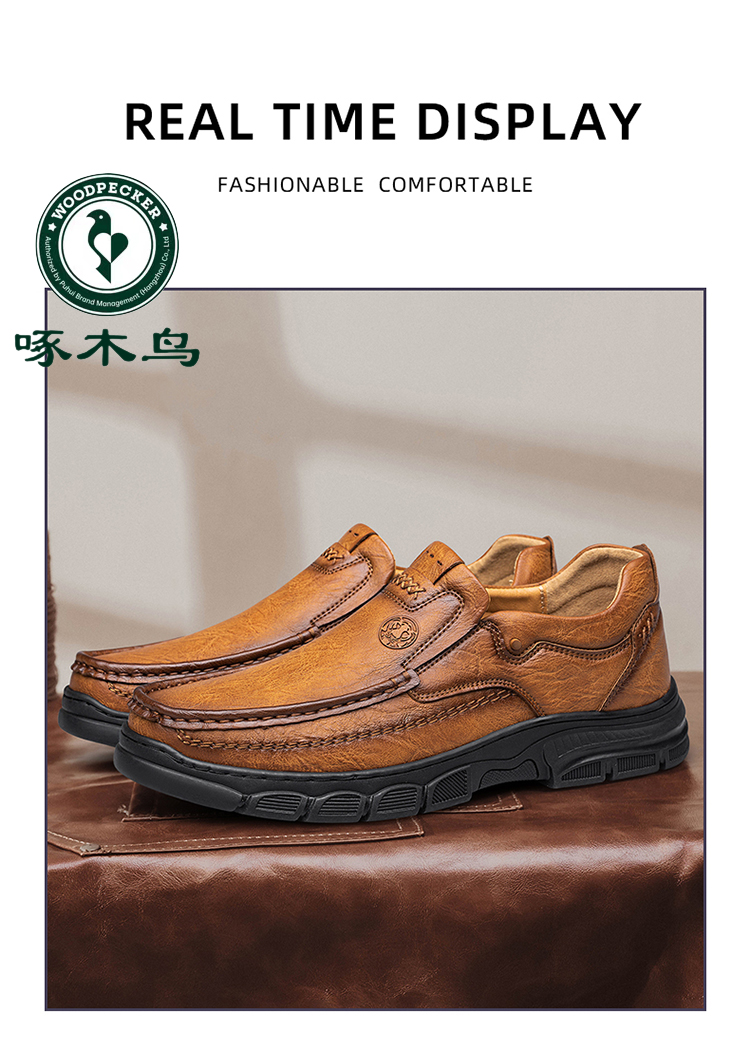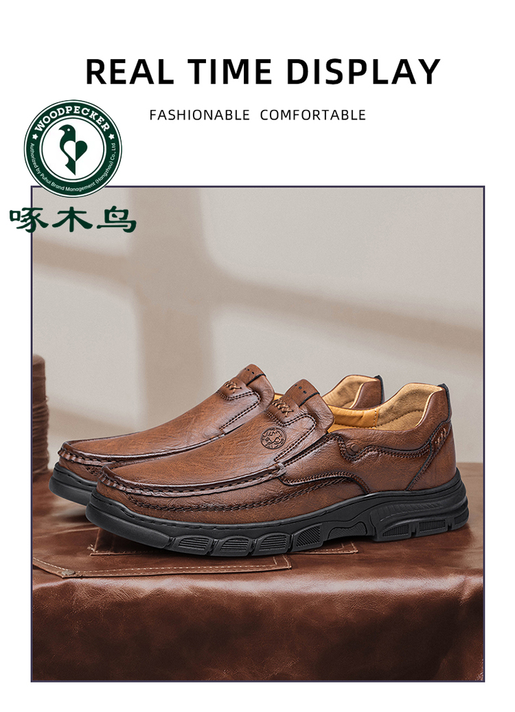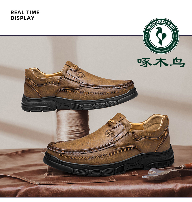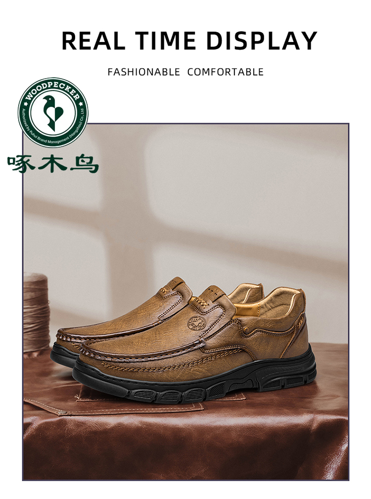Woodpecker Men's Shoes Spring and Autumn Business Casual Leather Shoes Men's Genuine Leather Soft Sole Non-Slip Slip-On Middle-Aged Dad Shoes