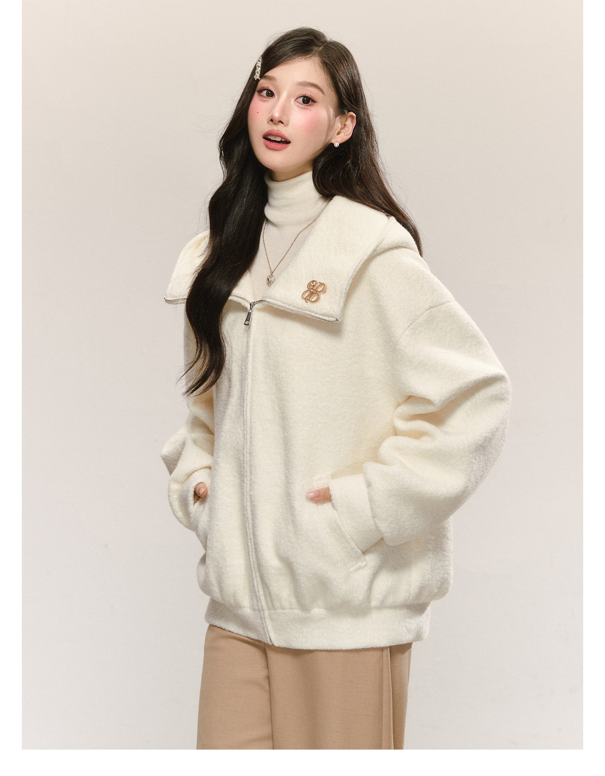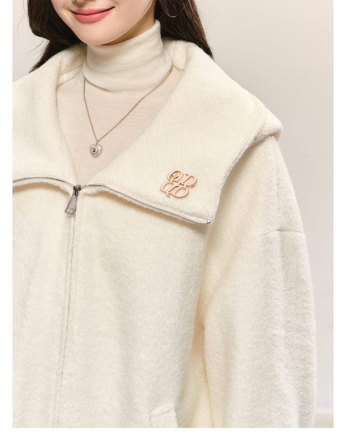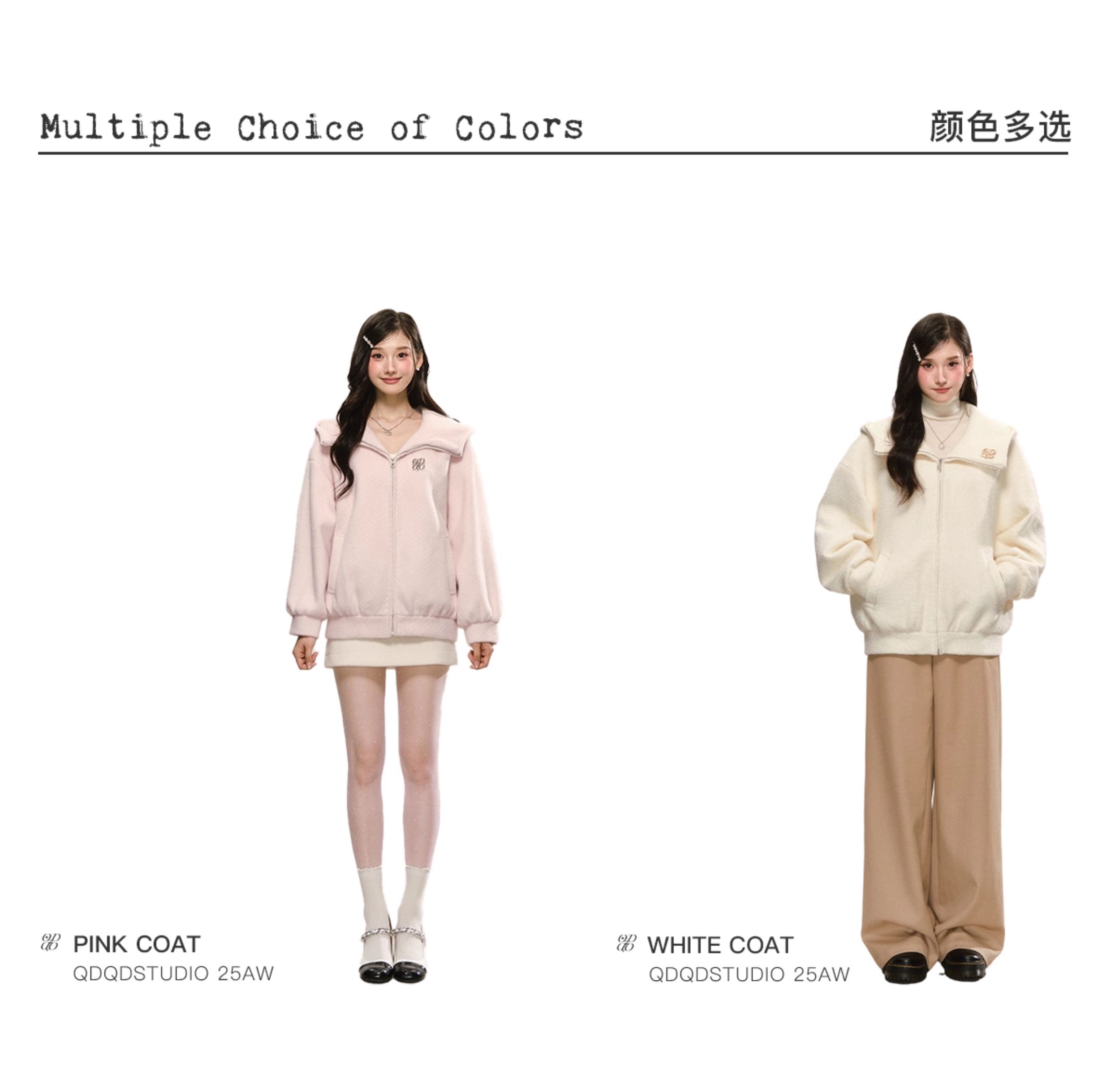 Qdqd Chanel-Style White Looped Wool Coat, Sweet and Girly, Preppy Style, Large Lapel, Hooded Long-Sleeve Top