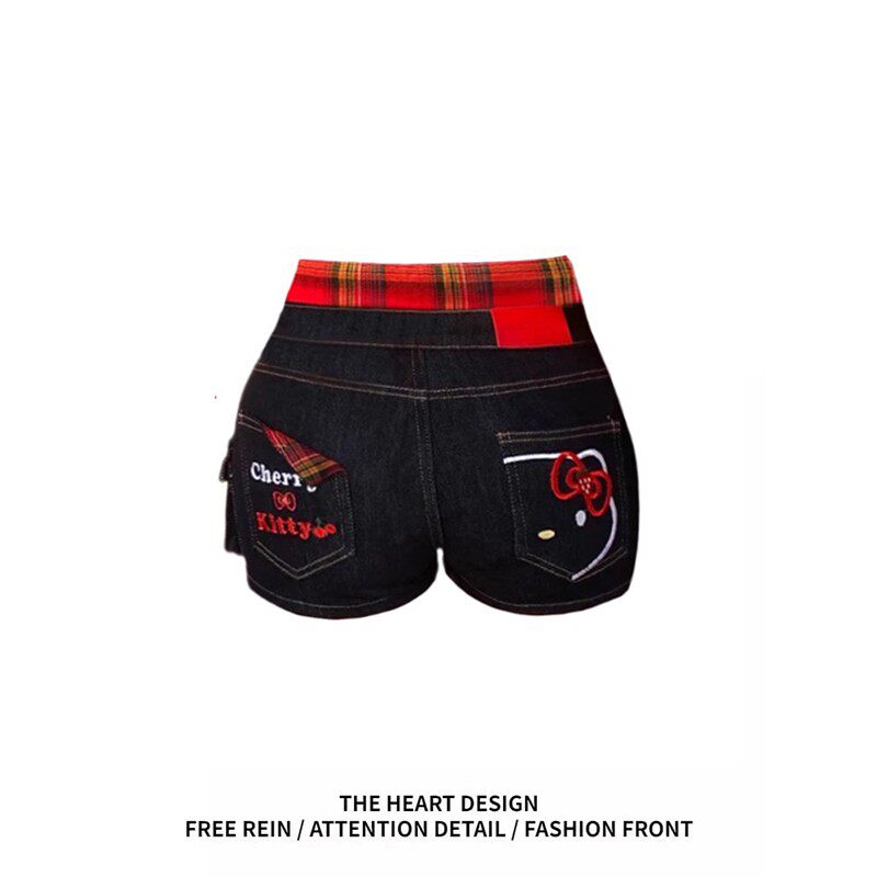 American-Style Hello Kitty Embroidered Hot Girl Denim Shorts for Women, Summer Design with Plaid Patchwork and Hip-Hugging Hot Pants